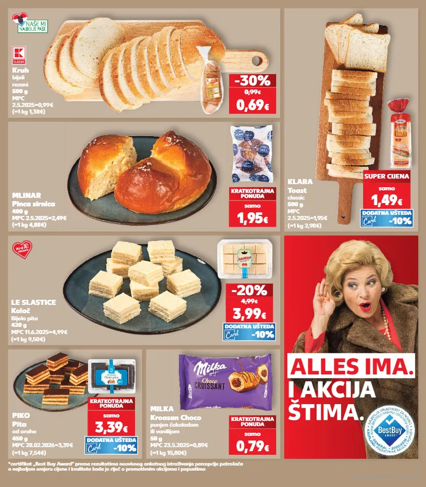 kratkotrajna ponuda samo kratkotrajna ponuda samo kratkotrajna ponuda (=1 kg 4,88€) mlinar pinca sirnica 400 g mpc 2.5.2025=2,49€ kratkotrajna ponuda milka kroasan choco punjen čokoladom ili vanilijom 50 g mpc 23.5.2025=0,89€ (=1 kg 15,80€) kratkotrajna ponuda samo 0,79 € samo 1,95 € (=1 kg 1,38€) kruh bijeli rezani 500 g mpc 2.5.2025=0,99€ -30% 0,69 € 0,99 € (=1 kg 7,54€) piko pita od oraha 450 g mpc 28.02.2026=3,39€ kratkotrajna ponuda samo 3,39 € -10% dodatna ušteda (=1 kg 9,50€) le slastice kolač bijela pita 420 g mpc 11.6.2025=4,99€ 3,99 € -20% 4,99 € -10% dodatna ušteda (=1 kg 2,98€) klara toast classic 500 g mpc 2.5.2025=1,95€ samo 1,49 € super cijena -10% dodatna ušteda *certifikat „best buy award“ prema rezultatima neovisnog anketnog istraživanja percepcije potrošača o najboljem omjeru cijene i kvalitete kada je riječ o promotivnim akcijama i popustima i akcija štima. alles ima. štima. s7-hr-kw13-lft-bp_2_r-1030-11 7