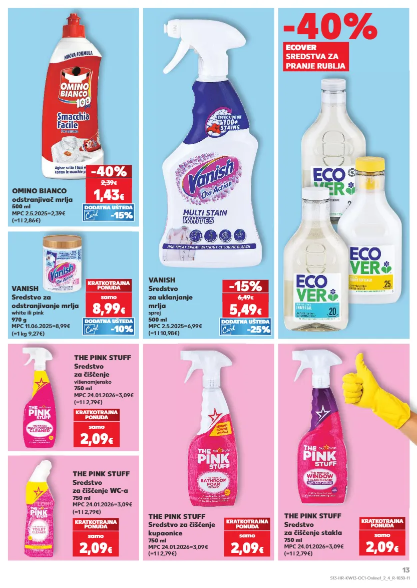 KRATKOTRAJNA PONUDA samo samo samo KRATKOTRAJNA PONUDA samo samo KRATKOTRAJNA PONUDA samo samo OMINO BIANCO odstranjivač mrlja 500 ml MPC 2.5.2025=2,39€ (=1 l 2,86€) -40% THE PINK STUFF Sredstvo za čišćenje stakla 750 ml MPC 24.01.2026=3,09€ (=1 l 2,79€) KRATKOTRAJNA PONUDA 2,09 € samo 1,43 € 2,39 € THE PINK STUFF Sredstvo za čišćenje WC-a 750 ml MPC 24.01.2026=3,09€ (=1 l 2,79€) KRATKOTRAJNA PONUDA 2,09 € samo THE PINK STUFF Sredstvo za čišćenje višenamjensko 750 ml MPC 24.01.2026=3,09€ (=1 l 2,79€) KRATKOTRAJNA PONUDA 2,09 € samo (=1 l 2,79€) THE PINK STUFF Sredstvo za čišćenje kupaonice 750 ml MPC 24.01.2026=3,09€ KRATKOTRAJNA PONUDA 2,09 € samo (=1 l 10,98€) VANISH Sredstvo za uklanjanje mrlja sprej 500 ml MPC 2.5.2025=6,99€ 5,49 € -15% 6,49 € (=1 kg 9,27€) VANISH Sredstvo za odstranjivanje mrlja white ili pink 970 g MPC 11.06.2025=8,99€ KRATKOTRAJNA PONUDA 8,99 € samo -10% DODATNA UŠTEDA -15% DODATNA UŠTEDA -25% DODATNA UŠTEDA ECOVER SREDSTVA ZA PRANJE RUBLJA -40% S13-HR-KW13-OC1-Online1_2_4_R-1030-11 13