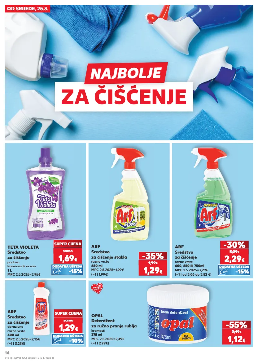 kratkotrajna ponuda samo kratkotrajna ponuda kratkotrajna ponuda samo samo kratkotrajna ponuda samo kratkotrajna ponuda samo od srijede, 25.3. arf sredstvo za čišćenje abrazivno razne vrste 400 ml mpc 2.5.2025=2,15€ (=1 l 3,23€) opal deterdžent za ručno pranje rublja kremasti 375 ml mpc 2.5.2025=2,49€ (=1 l 2,99€) -55% 1,12 € 2,49 € arf sredstvo za čišćenje stakla razne vrste 650 ml mpc 2.5.2025=1,99€ (=1 l 1,99€) teta violeta sredstvo za čišćenje podova luxorious ili ocean 1 l mpc 2.5.2025=2,95€ super cijena -35% 1,69 € samo 1,29 € 1,99 € (=1 l od 3,06 do 3,82 €) arf sredstvo za čišćenje razne vrste 600, 650 ili 750ml mpc 2.5.2025=3,29€ 2,29 € -30% 3,29 € -15% dodatna ušteda -15% dodatna ušteda super cijena 1,29 € samo -10% dodatna ušteda za čišćenje za čišćenje najbolje s14-hr-kw13-oc1-online1_2_5_l-1030-11 14