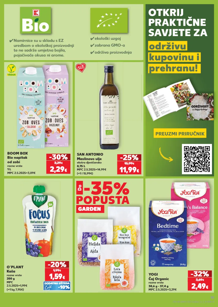 kratkotrajna ponuda kratkotrajna ponuda samo samo kratkotrajna ponuda samo kratkotrajna ponuda samo ✓ekološki uzgoj ✓namirnice su u skladu s ez uredbom o ekološkoj proizvodnji te ne sadrže umjetna bojila, pojačivače okusa ni arome. ✓zabrana gmo-a ✓održiva proizvodnja san antonio maslinovo ulje ekstra djevičansko 0,75 l mpc 2.5.2025=14,99€ (=1 l 15,99€) -25% yogi čaj organic razne vrste 30,6 g - 37,4 g mpc 2.5.2025=3,29€ -32% 11,99 € 15,99 € 2,49 € 3,69 € boom box bio napitak od zobi razne vrste 1 l mpc 2.5.2025=3,09€ -30% 2,29 € 3,29 € -35 % popusta garden do (=1 kg 7,95€) o`plant kaša razne vrste 200 g mpc 2.5.2025=1,99€ 1,59 € -20% 1,99 € -10% dodatna ušteda otkrij praktične savjete za održivu kupovinu i prehranu! preuzmi priručnik s19-hr-kw13-oc1-online1_5_2_r-1030-11 19