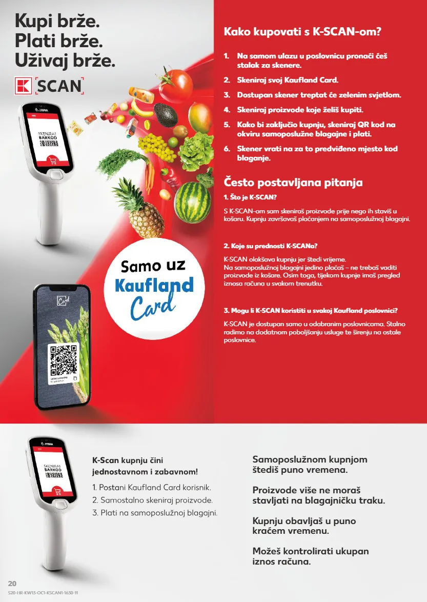 Kupi brže. Plati brže. Uživaj brže. Samoposlužnom kupnjom štediš puno vremena. Proizvode više ne moraš stavljati na blagajničku traku. Kupnju obavljaš u puno kraćem vremenu. Možeš kontrolirati ukupan iznos računa. Kako kupovati s K-SCAN-om? 1. Na samom ulazu u poslovnicu pronaći ćeš stalak za skenere. 2. Skeniraj svoj Kaufland Card. 3. Dostupan skener treptat će zelenim svjetlom. 4. Skeniraj proizvode koje želiš kupiti. 5. Kako bi zaključio kupnju, skeniraj QR kod na okviru samoposlužne blagajne i plati. 6. Skener vrati na za to predviđeno mjesto kod blaganje. K-Scan kupnju čini jednostavnom i zabavnom! 1. Postani Kaufland Card korisnik. 2. Samostalno skeniraj proizvode. 3. Plati na samoposlužnoj blagajni. Često postavljana pitanja 1. Što je K-SCAN? S K-SCAN-om sam skeniraš proizvode prije nego ih staviš u košaru. Kupnju završavaš plaćanjem na samoposlužnoj blagajni. 2. Koje su prednosti K-SCANa? K-SCAN olakšava kupnju jer štedi vrijeme. Na samoposlužnoj blagajni jedino plaćaš – ne trebaš vaditi proizvode iz košare. Osim toga, tijekom kupnje imaš pregled iznosa računa u svakom trenutku. 3. Mogu li K-SCAN koristiti u svakoj Kaufland poslovnici? K-SCAN je dostupan samo u odabranim poslovnicama. Stalno radimo na dodatnom poboljšanju usluge te širenju na ostale poslovnice. K-Scan kupnju čini jednostavnom i zabavnom! 1. Postani Kaufland Card korisnik. 2. Samostalno skeniraj proizvode. 3. Plati na samoposlužnoj blagajni. S20-HR-KW13-OC1-KSCAN1-1630-11 20