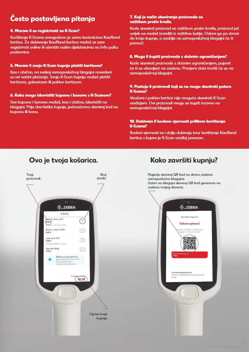 Tvoji proizvodi. Broj stavki. Ovo je tvoja košarica. Najprije skeniraj QR kod na okviru zaslona samoposlužne blagajne. Zatim na blagajni skeniraj QR kod generiran na zaslonu tvojeg skenera. Kako završiti kupnju? Cijena tvoje kupnje. Često postavljena pitanja 4. Moram li se registrirati za K-Scan? Korištenje K-Scana omogućeno je samo korisnicima Kaufland kartice. Za dobivanje Kaufland kartice možeš se sam registrirati online ili obratiti našim djelatnicima na Info pultu poslovnice. 5. Moram li svoju K-Scan kupnju platiti karticom? Kao i obično, na svakoj samoposlužnoj blagajni navedeni su svi načini plaćanja. Svoju K-Scan kupnju možeš platiti karticom, gotovinom ili poklon karticom. 6. Kako mogu iskoristiti kupone i bonove s K-Scanom? Sve kupone i bonove možeš, kao i obično, iskoristiti na blagajni. Prije dovršetka kupnje, jednostavno skeniraj kod na kuponu ili bonu. 7. Koji je način skeniranja proizvoda sa zaštitom protiv krađe. Kada skeniraš proizvod sa zaštitom protiv krađe, proizvod još uvijek ne možeš izvaditi iz zaštitne kutije. Ostavi ga po strani do kraja kupnje, a osoblje na samoposlužnoj blagajni će ti pomoći. 8. Mogu li kupiti proizvode s dobnim ograničenjem? Kada skeniraš proizvode s dobnim ograničenjem, pojavit će ti se obavijest na zaslonu. Provjera dobi izvršit će se na samoposlužnoj blagajni. 9. Postoje li proizvodi koji se ne mogu skenirati putem K-Scana? Vaučere i poklon kartice nije moguće skenirati K-Scan uređajem. Ovi proizvodi mogu se kupiti izravno na samoposlužnoj blagajni. 10. Dobivam li bodove vjernosti prilikom korištenja K-Scana? Bodovi vjernosti se i dalje dobivaju kroz korištenje Kaufland kartice s kojom je K-Scan uređaj povezan. S21-HR-KW13-OC1-KSCAN2-1630-11 21