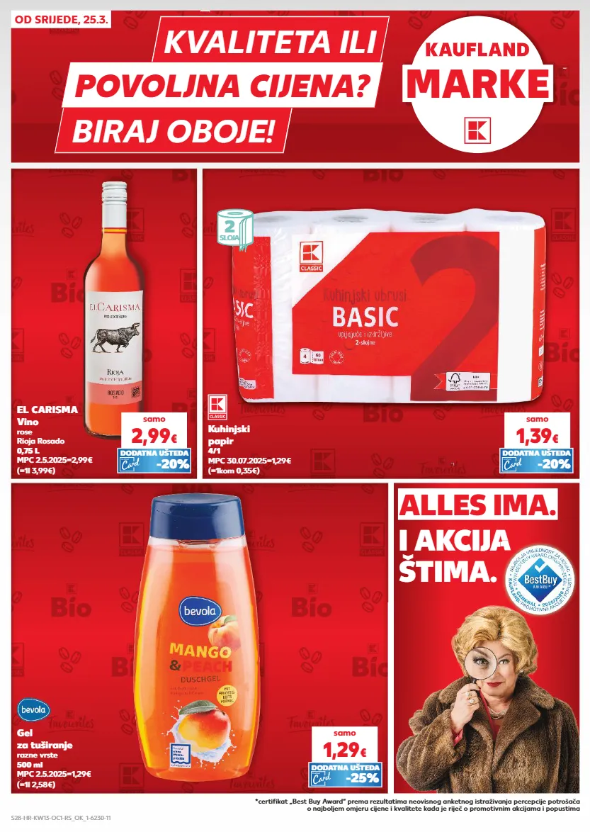 marke alles ima. i akcija štima. biraj oboje! kvaliteta ili povoljna cijena? od srijede, 25.3. (=1l 3,99€) el carisma vino rose rioja rosado 0,75 l mpc 2.5.2025=2,99€ samo 2,99 € -20% dodatna ušteda (=1kom 0,35€) kuhinjski papir 4/1 mpc 30.07.2025=1,29€ samo 1,39 € (=1l 2,58€) gel za tuširanje razne vrste 500 ml mpc 2.5.2025=1,29€ samo 1,29 € -25% dodatna ušteda -20% dodatna ušteda 2 sloja i akcija *certifikat „best buy award“ prema rezultatima neovisnog anketnog istraživanja percepcije potrošača o najboljem omjeru cijene i kvalitete kada je riječ o promotivnim akcijama i popustima s28-hr-kw13-oc1-rs_ok_1-6230-11