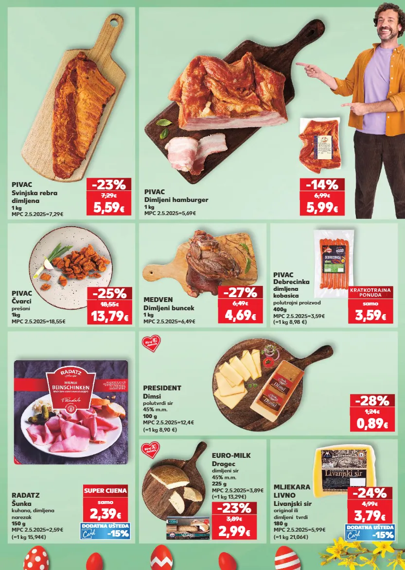 kratkotrajna ponuda kratkotrajna ponuda kratkotrajna ponuda samo samo kratkotrajna ponuda samo kratkotrajna ponuda samo samo kratkotrajna ponuda kratkotrajna ponuda samo samo kratkotrajna ponuda samo kratkotrajna ponuda samo pivac svinjska rebra dimljena 1 kg mpc 2.5.2025=7,29€ -23% (=1 kg 13,29€) euro-milk dragec dimljeni sir 45% m.m. 225 g mpc 2.5.2025=3,89€ -23% radatz šunka kuhana, dimljena narezak 150 g mpc 2.5.2025=2,59€ (=1 kg 15,94€) super cijena 2,39 € samo 5,59 € 7,29 € pivac dimljeni hamburger 1 kg mpc 2.5.2025=5,69€ -14% 5,99 € 6,99 € pivac čvarci prešani 1kg mpc 2.5.2025=18,55€ -25% 13,79 € 18,55 € 2,99 € 3,89 € (=1 kg 21,06€) mljekara livno livanjski sir original ili dimljeni tvrdi 180 g mpc 2.5.2025=5,99€ medven dimljeni buncek 1 kg mpc 2.5.2025=6,49€ president dimsi polutvrdi sir 45% m.m. 100 g mpc 2.5.2025=12,4€ (=1 kg 8,90 €) -28% -27% 4,69 € 6,49 € 0,89 € 1,24 € pivac debrecinka dimljena kobasica polutrajni proizvod 400g mpc 2.5.2025=3,59€ (=1 kg 8,98 €) kratkotrajna - 00% kratkotrajna 00% 00% kratkotrajna ponuda 00% 00% ponuda 3,59 € samo 3,79 € -24% 4,99 € -15% dodatna ušteda -15% dodatna ušteda s5-hr-kw13-oc1-online1_4_2_r-1030-11 5