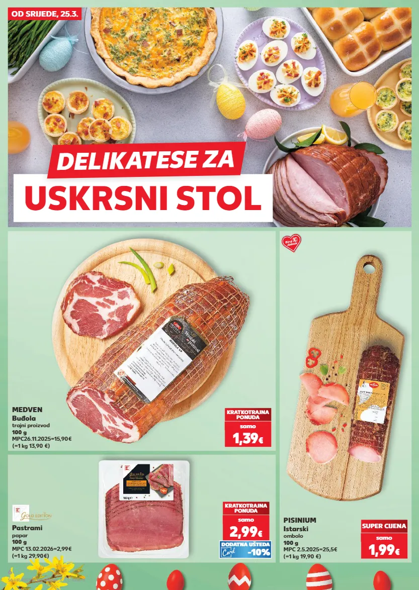 kratkotrajna ponuda samo samo samo od srijede, 25.3. medven buđola trajni proizvod 100 g mpc26.11.2025=15,90€ pisinium istarski ombolo 100 g mpc 2.5.2025=25,5€ (=1 kg 19,90 €) pastrami papar 100 g mpc 13.02.2026=2,99€ (=1 kg 29,90€) (=1 kg 13,90 €) super cijena kratkotrajna ponuda 1,39 € samo 1,99 € samo kratkotrajna ponuda 2,99 € samo -10% dodatna ušteda uskrsni stol uskrsni stol delikatese za s6-hr-kw13-oc1-online1_3_1_l-1030-11 6