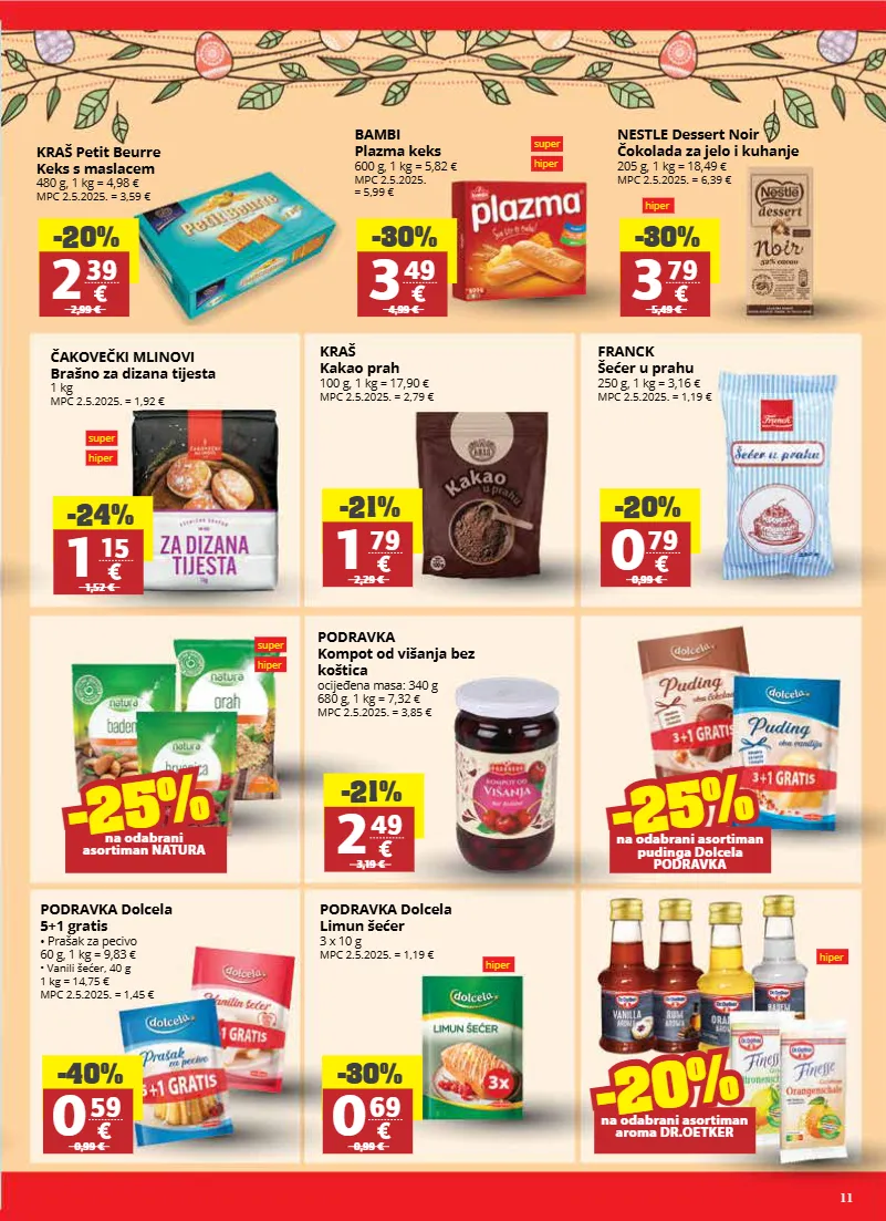 11 super hiper super hiper hiper hiper hiper kraš petit beurre keks s maslacem 480 g, 1 kg = 4,98 € mpc 2.5.2025. = 3,59 € kraš kakao prah 100 g, 1 kg = 17,90 € mpc 2.5.2025. = 2,79 € podravka dolcela 5+1 gratis • prašak za pecivo 60 g, 1 kg = 9,83 € • vanili šećer, 40 g 1 kg = 14,75 € mpc 2.5.2025. = 1,45 € franck šećer u prahu 250 g, 1 kg = 3,16 € mpc 2.5.2025. = 1,19 € podravka dolcela limun šećer 3 x 10 g mpc 2.5.2025. = 1,19 € bambi plazma keks 600 g, 1 kg = 5,82 € mpc 2.5.2025. = 5,99 € nestle dessert noir čokolada za jelo i kuhanje 205 g, 1 kg = 18,49 € mpc 2.5.2025. = 6,39 € -20% 2 39 2,99 € -30% 3 49 4,99 € -30% 3 79 5,49 € podravka kompot od višanja bez koštica ocijeđena masa: 340 g 680 g, 1 kg = 7,32 € mpc 2.5.2025. = 3,85 € -21% 2 49 3,19 € -21% 1 79 2,29 € -20% 0 79 0,99 € super hiper čakovečki mlinovi brašno za dizana tijesta 1 kg mpc 2.5.2025. = 1,92 € -24% 1 15 1,52 € -40% 0 59 0,99 € -30% 0 69 0,99 € -25% -25% na odabrani asortiman pudinga dolcela podravka -20% -20% na odabrani asortiman aroma dr.oetker -25% -25% na odabrani asortiman natura