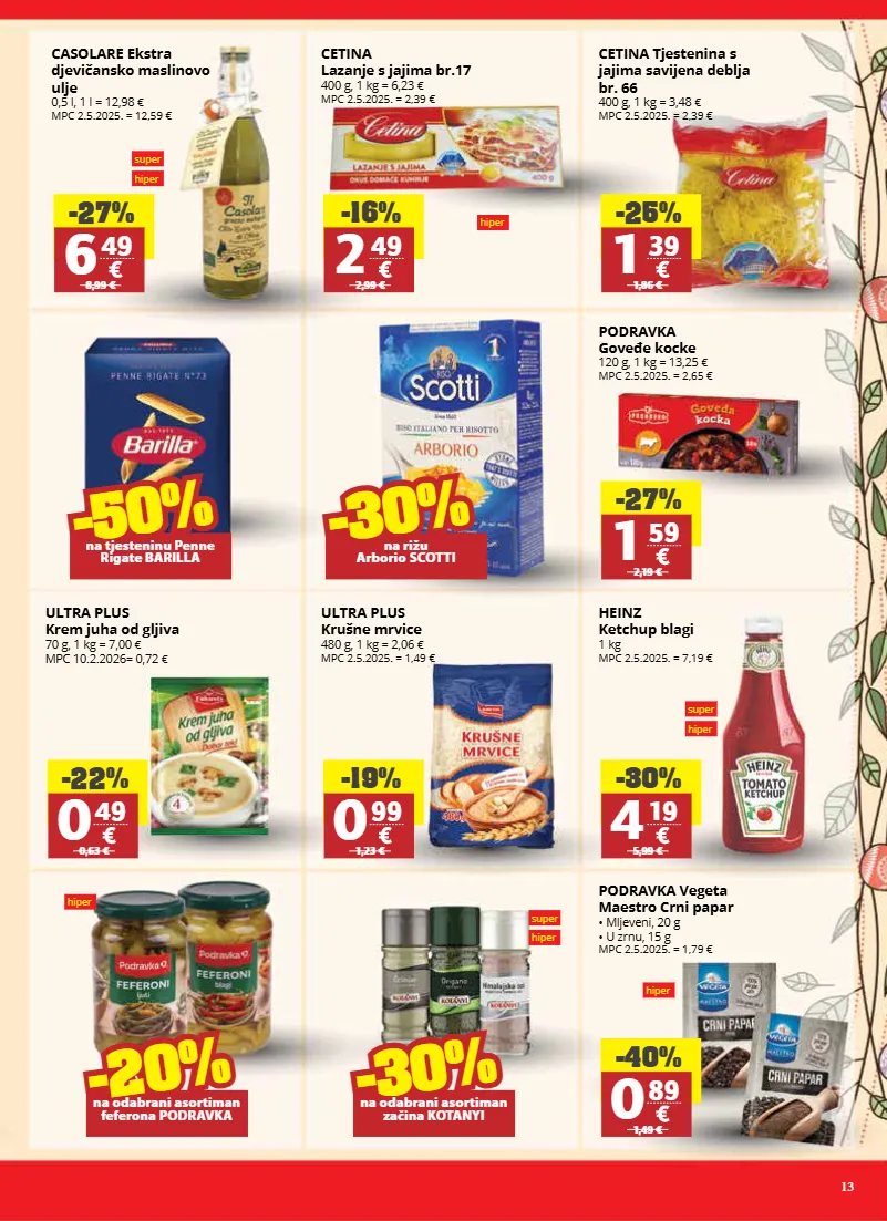 13 super hiper super hiper hiper hiper super hiper hiper casolare ekstra djevičansko maslinovo ulje 0,5 l, 1 l = 12,98 € mpc 2.5.2025. = 12,59 € podravka goveđe kocke 120 g, 1 kg = 13,25 € mpc 2.5.2025. = 2,65 € ultra plus krem juha od gljiva 70 g, 1 kg = 7,00 € mpc 10.2.2026= 0,72 € ultra plus krušne mrvice 480 g, 1 kg = 2,06 € mpc 2.5.2025. = 1,49 € podravka vegeta maestro crni papar • mljeveni, 20 g • u zrnu, 15 g mpc 2.5.2025. = 1,79 € heinz ketchup blagi 1 kg mpc 2.5.2025. = 7,19 € cetina lazanje s jajima br.17 400 g, 1 kg = 6,23 € mpc 2.5.2025. = 2,39 € cetina tjestenina s jajima savijena deblja br. 66 400 g, 1 kg = 3,48 € mpc 2.5.2025. = 2,39 € -27% 6 49 8,99 € -16% 2 49 2,99 € -25% 1 39 1,86 € -27% 1 59 2,19 € -22% 0 49 0,63 € -19% 0 99 1,23 € -30% 4 19 5,99 € -40% 0 89 1,49 € -50% -50% na tjesteninu penne rigate barilla -30% -30% na rižu arborio scotti -30% -20% na odabrani asortiman feferona podravka -30% -30% na odabrani asortiman začina kotanyi