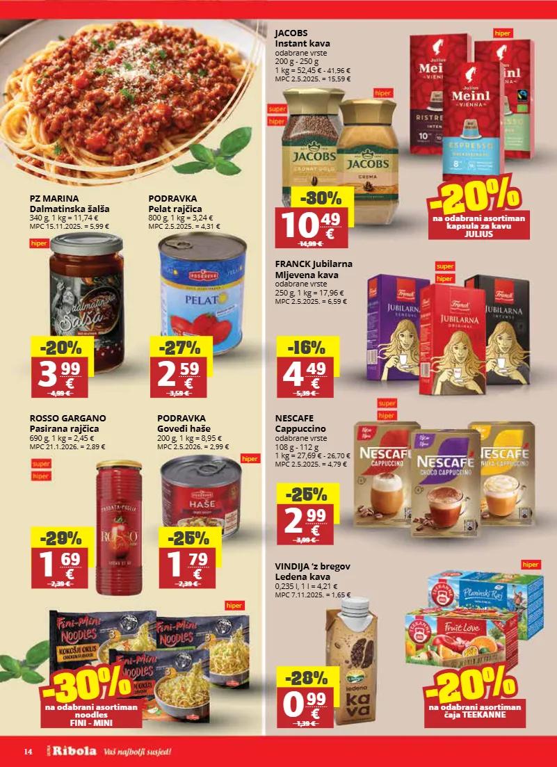 14 -20% 3 99 4,99 € -27% 2 59 3,59 € -29% 1 69 2,39 € -16% 4 49 5,39 € -25% 2 99 3,99 € -28% 0 99 1,39 € -25% 1 79 2,39 € pz marina dalmatinska šalša 340 g, 1 kg = 11,74 € mpc 15.11.2025. = 5,99 € podravka pelat rajčica 800 g, 1 kg = 3,24 € mpc 2.5.2025. = 4,31 € franck jubilarna mljevena kava odabrane vrste 250 g, 1 kg = 17,96 € mpc 2.5.2025. = 6,59 € rosso gargano pasirana rajčica 690 g, 1 kg = 2,45 € mpc 21.1.2026. = 2,89 € jacobs instant kava odabrane vrste 200 g - 250 g 1 kg = 52,45 € - 41,96 € mpc 2.5.2025. = 15,59 € nescafe cappuccino odabrane vrste 108 g - 112 g 1 kg = 27,69 € - 26,70 € mpc 2.5.2025. = 4,79 € vindija ‘z bregov ledena kava 0,235 l, 1 l = 4,21 € mpc 7.11.2025. = 1,65 € podravka goveđi haše 200 g, 1 kg = 8,95 € mpc 2.5.2026. = 2,99 € -30% -30% na odabrani asortiman noodles fini - mini -30% 10 49 14,99 € -30% -20% na odabrani asortiman kapsula za kavu julius -30% -20% na odabrani asortiman čaja teekanne hiper hiper hiper hiper super hiper hiper