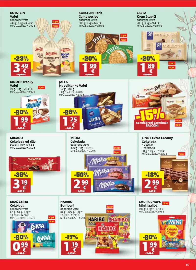 15 -23% 3 49 4,59 € -20% 1 99 2,49 € -20% 1 89 2,39 € -26% 1 25 1,69 € -36% 3 19 4,99 € -18% 2 99 3,69 € -28% 0 99 1,39 € -17% 1 19 1,45 € -20% 1 99 2,49 € -50% 2 99 5,99 € -20% 1 99 2,49 € koestlin vafel odabrane vrste 740 g, 1 kg = 4,72 € mpc 2.5.2025. = 5,99 € koestlin paris čajno pecivo odabrane vrste 300 g, 1 kg = 6,63 € mpc 2.5.2025. = 2,99 € lasta krem štapići odabrane vrste 200 g, 1 kg = 9,45 € mpc 2.5.2025. = 2,91 € kinder tronky vafel 90 g, 1 kg = 22,11 € mpc 2.5.2025. = 2,99 € jaffa napolitanke vafel 160 g - 187 g 1 kg = 7,81 € - 6,68 € mpc 2.5.2025. = 2,15 € mikado čokolada od riže 300 g, 1 kg = 10,63 € mpc 2.5.2025. = 5,59 € milka čokolada odabrane vrste 300 g, 1 kg = 9,97 € mpc 2.5.2025. = 7,29 € lindt extra creamy čokolada • lješnjak • karamela 80 g, 1 kg = 37,38 € mpc 2.5.2025. = 4,39 € kraš čoksa čokolada odabrane vrste 67 g - 68 g, 1 kg = 14,78 € - 14,56 € mpc 2.5.2025. = 1,65 € haribo bomboni odabrane vrste 85 g - 100 g, 1 kg = 14,00 € - 11,90 € mpc 2.5.2025. = 1,79 € chupa chups mini lizalice 108 g, 1 kg = 18,43 € mpc 2.5.2025. = 2,99 € -15% -15% na odabrani asortiman balconi super hiper super hiper super hiper super hiper super hiper super hiper super hiper hiper hiper hiper