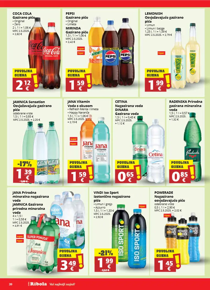 20 super hiper hiper super hiper super hiper hiper hiper coca cola gazirano piće • original • zero 2 l, 1 l = 1,06 € mpc 2.5.2025. = 2,82 € lemonish osvježavajuće gazirano piće • limun • limun i bazga 1,25 l, 1 l = 1,59 € mpc 2.5.2025. = 2,79 € jamnica sensation osvježavajuće gazirano piće odabrane vrste 1,5 l, 1 l = 0,93 € mpc 2.5.2025. = 2,25 € jana vitamin voda s okusom • refresh menta i limeta • happy naranča 1,5 l, 1 l = 1,06 € mpc 2.5.2025. = 2,19 € cetina negazirana voda dinara gazirana voda 1,5 l, 1 l = 0,43 € mpc 2.5.2025. = 1,12 € radenska prirodna gazirana mineralna voda 1,5 l, 1 l = 0,57 € mpc 2.5.2025. = 1,32 € vindi iso sport izotonično negazirano piće • limun i grejp • azzurro 1,5 l, 1 l = 1,33 € mpc 2.5.2025. = 2,92 € powerade negazirano osvježavajuće piće odabrane vrste 0,5 l, 1 l = 2,90 € mpc 2.5.2025. = 2,02 € jana prirodna mineralna negazirana voda jamnica gazirana prirodna mineralna voda 4 x 1,5 l 1 l = 0,58 € mpc 2.5.2025. = 4,91 € pepsi gazirano piće • original • limeta mirinda gazirano piće 1,5 l, 1 l = 1,06 € mpc 2.5.2025. = 2,42 € -17% 1 39 1,69 € -21% 1 99 2,52 € 2 12 ! ! povoljna cijena 1 59 ! ! povoljna cijena 1 99 ! ! povoljna cijena 1 59 ! ! povoljna cijena 0 65 ! ! povoljna cijena 0 85 ! ! povoljna cijena 1 45 ! ! povoljna cijena 3 49 ! ! povoljna cijena