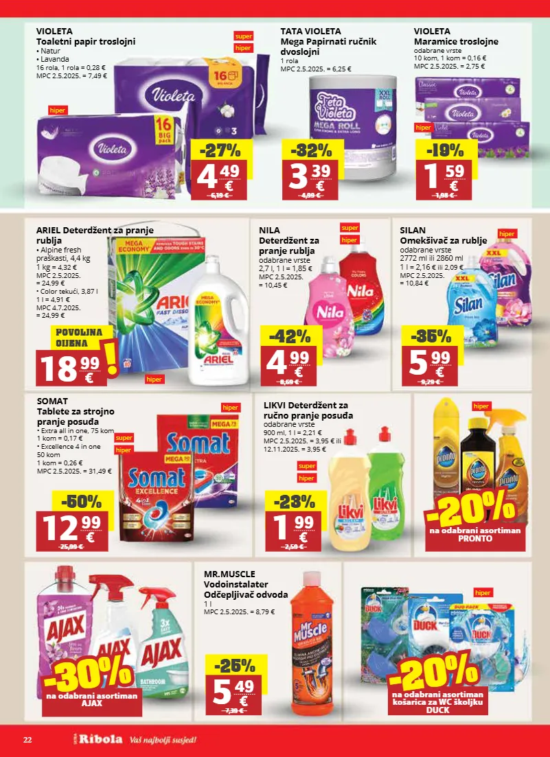 22 super hiper super hiper super hiper hiper hiper hiper super hiper hiper hiper hiper hiper -42% 4 99 8,69 € -35% 5 99 9,29 € -23% 1 99 2,59 € -25% 5 49 7,39 € -27% 4 49 6,19 € -32% 3 39 4,99 € -19% 1 59 1,98 € -50% 12 99 25,99 € ariel deterdžent za pranje rublja • alpine fresh praškasti, 4,4 kg 1 kg = 4,32 € mpc 2.5.2025. = 24,99 € • color tekući, 3,87 l 1 l = 4,91 € mpc 4.7.2025. = 24,99 € nila deterdžent za pranje rublja odabrane vrste 2,7 l, 1 l = 1,85 € mpc 2.5.2025. = 10,45 € silan omekšivač za rublje odabrane vrste 2772 ml ili 2860 ml 1 l = 2,16 € ili 2,09 € mpc 2.5.2025. = 10,84 € somat tablete za strojno pranje posuđa • extra all in one, 75 kom 1 kom = 0,17 € • excellence 4 in one 50 kom 1 kom = 0,26 € mpc 2.5.2025. = 31,49 € likvi deterdžent za ručno pranje posuđa odabrane vrste 900 ml, 1 l = 2,21 € mpc 2.5.2025. = 3,95 € ili 12.11.2025. = 3,95 € violeta toaletni papir troslojni • natur • lavanda 16 rola, 1 rola = 0,28 € mpc 2.5.2025. = 7,49 € tata violeta mega papirnati ručnik dvoslojni 1 rola mpc 2.5.2025. = 6,25 € violeta maramice troslojne odabrane vrste 10 kom, 1 kom = 0,16 € mpc 2.5.2025. = 2,75 € mr.muscle vodoinstalater odčepljivač odvoda 1 l mpc 2.5.2025. = 8,79 € -30% -20% na odabrani asortiman pronto -30% -20% na odabrani asortiman košarica za wc školjku duck -30% -30% na odabrani asortiman ajax 18 99 ! ! povoljna cijena