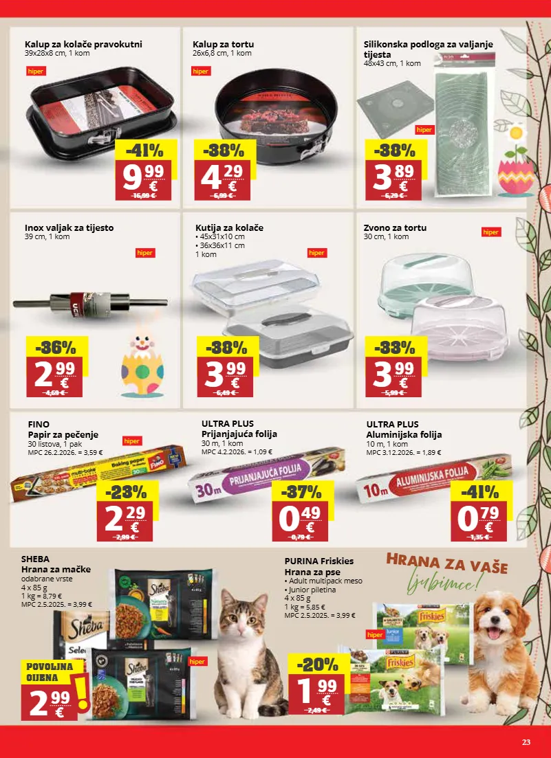 23 hiper hiper hiper hiper hiper hiper hiper kalup za kolače pravokutni 39x28x8 cm, 1 kom kalup za tortu 26x6,8 cm, 1 kom kutija za kolače • 45x31x10 cm • 36x36x11 cm 1 kom zvono za tortu 30 cm, 1 kom fino papir za pečenje 30 listova, 1 pak mpc 26.2.2026. = 3,59 € ultra plus aluminijska folija 10 m, 1 kom mpc 3.12.2026. = 1,89 € silikonska podloga za valjanje tijesta 48x43 cm, 1 kom inox valjak za tijesto 39 cm, 1 kom -41% 9 99 16,99 € -38% 4 29 6,99 € -38% 3 99 6,49 € -33% 3 99 5,99 € -23% 2 29 2,99 € -41% 0 79 1,35 € ultra plus prijanjajuća folija 30 m, 1 kom mpc 4.2.2026. = 1,09 € -37% 0 49 0,79 € -38% 3 89 6,29 € -36% 2 99 4,69 € sheba hrana za mačke odabrane vrste 4 x 85 g 1 kg = 8,79 € mpc 2.5.2025. = 3,99 € purina friskies hrana za pse • adult multipack meso • junior piletina 4 x 85 g 1 kg = 5,85 € mpc 2.5.2025. = 3,99 € 2 99 ! ! povoljna cijena -20% 1 99 2,49 € hiper hiper hrana za vaše ljubimce!