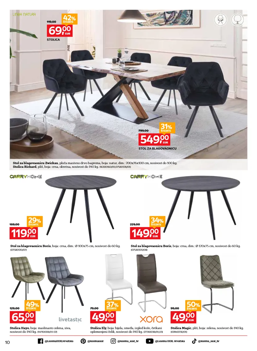 10 @lesnina xxxl hrvatska @lesninaxxxlhrvatska @lesninaxxxl @lesnina_xxxl_hr @lesnina_xxxl_hr stolica magic , pliš, boja: zelena, nosivost do 140 kg. (02890230/01) stolica hayo , boja: maslinasto zelena, siva, nosivost do 140 kg. (19710008/01-02) stolica ely , boja: bijela, smeđa, izgled kože, četkani oplemenjeni čelik, nosivost do 140 kg. (27310038/01,03) stol za blagovaonicu boris , boja: crna, dim.: ø 100x75 cm, nosivost do 60 kg. (07580120/07) stol za blagovaonicu boris , boja: crna, dim.: ø 120x75 cm, nosivost do 60 kg. (07580120/08) stol za blagovaonicu zwickau , ploča masivno drvo bagrema, boja: natur, dim.: 200x76x100 cm, nosivost do 100 kg. stolica richard , pliš, boja: crna, okretna, nosivost do 140 kg. (16300160/01;07580128/01) 69, 00 eur 119,00 stolica 42 % štedite 549, 00 eur 799,00 stol za blagovaonicu 31 % štedite 119, 00 eur 169,00 29 % štedite 149, 00 eur 229,00 34 % štedite 49, 00 eur 99,00 50 % štedite 49, 00 eur 79,00 37 % štedite 65, 00 eur 129,00 49 % štedite