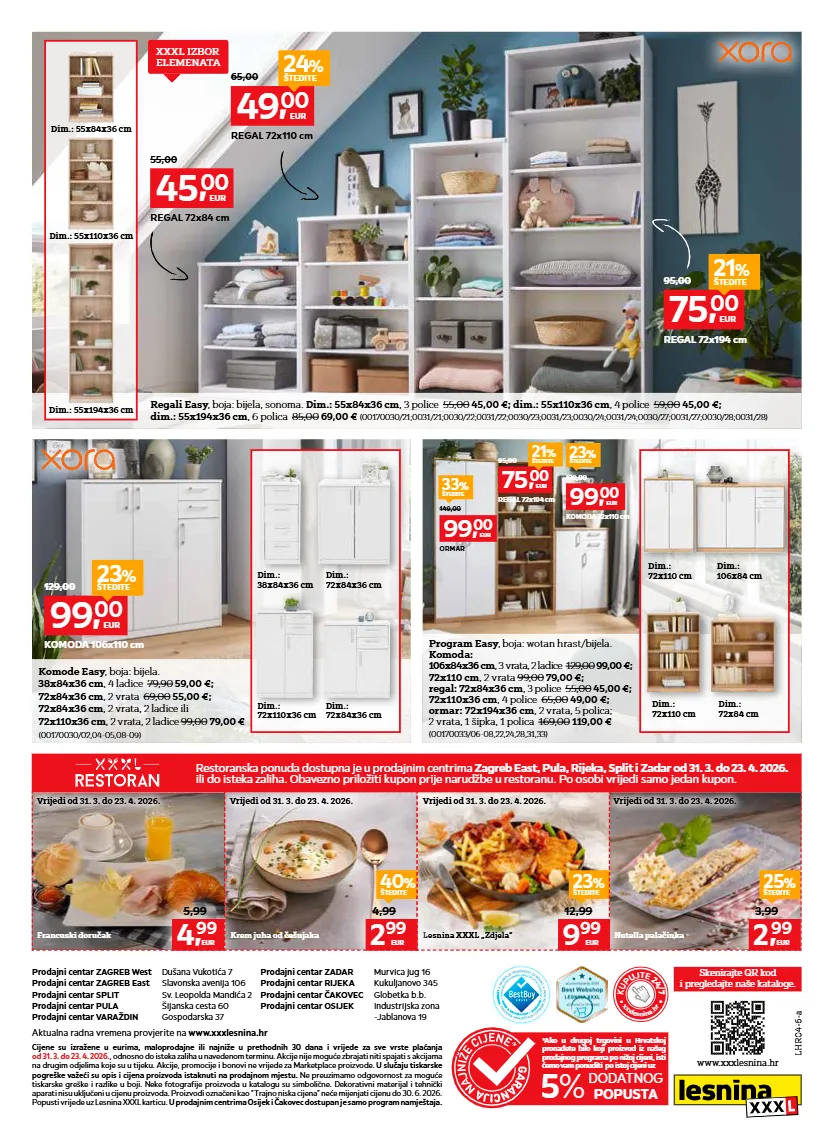lhr04-6-a aktualna radna vremena provjerite na www.xxxlesnina.hr cijene su izražene u eurima, maloprodajne ili najniže u prethodnih 30 dana i vrijede za sve vrste plaćanja od 31. 3. do 23. 4. 2026. , odnosno do isteka zaliha u navedenom terminu. akcije nije moguće zbrajati niti spajati s akcijama na drugim odjelima koje su u tijeku. akcije, promocije i bonovi ne vrijede za marketplace proizvode. u slučaju tiskarske pogreške važeći su opis i cijena proizvoda istaknuti na prodajnom mjestu. ne preuzimamo odgovornost za moguće tiskarske greške i razlike u boji. neke fotografije proizvoda u katalogu su simbolične. dekorativni materijal i tehnički aparati nisu uključeni u cijenu proizvoda. proizvodi označeni kao “trajno niska cijena” neće mijenjati cijenu do 30. 6. 2026. popusti vrijede uz lesnina xxxl karticu. u prodajnim centrima osijek i čakovec dostupan je samo program namještaja. *ako u drugoj trgovini u hrvatskoj pronađete bilo koji proizvod iz našeg prodajnog programa po nižoj cijeni, isti ćemo vam ponuditi po istoj cijeni uz 5 % dodatnog popusta prodajni centar zagreb west dušana vukotića 7 prodajni centar zagreb east slavonska avenija 106 prodajni centar split sv. leopolda mandića 2 prodajni centar pula šijanska cesta 60 prodajni centar varaždin gospodarska 37 prodajni centar zadar murvica jug 16 prodajni centar rijeka kukuljanovo 345 prodajni centar čakovec globetka b.b. prodajni centar osijek industrijska zona -jablanova 19 www.xxxlesnina.hr skenirajte qr kod i pregledajte naše kataloge. • k u p u j t e 2 4 / 7 • x x x l e s n i n a . h r restoranska ponuda dostupna je u prodajnim centrima zagreb east, pula, rijeka, split i zadar od 31. 3. do 23. 4. 2026. ili do isteka zaliha. obavezno priložiti kupon prije narudžbe u restoranu. po osobi vrijedi samo jedan kupon. vrijedi od 31. 3. do 23. 4. 2026. vrijedi od 31. 3. do 23. 4. 2026. francuski doručak vrijedi od 31. 3. do 23. 4. 2026. krem juha od češnjaka vrijedi od 31. 3. do 23. 4. 2026. lesnina xxxl „zdjela“ 25 % štedite nutella palačinka 4, 99 eur 5,99 2, 99 eur 40 % štedite 2 99 eur 4,99 23 % štedite 9 99 eur 12,99 3,99 75, 00 eur 95,00 regal 72x194 cm 21 % štedite 49, 00 eur 65,00 regal 72x110 cm 24 % štedite 45, 00 eur 55,00 regal 72x84 cm regali easy , boja: bijela, sonoma. dim.: 55x84x36 cm , 3 police 55,00 45,00 €; dim.: 55x110x36 cm , 4 police 59,00 45,00 €; dim.: 55x194x36 cm , 6 polica 85,00 69,00 € (00170030/21;0031/21;0030/22;0031/22;0030/23;0031/23;0030/24;0031/24;0030/27;0031/27;0030/28;0031/28) dim.: 55x84x36 cm dim.: 55x110x36 cm dim.: 55x194x36 cm dim.: 38x84x36 cm dim.: 72x110 cm dim.: 72x110 cm dim.: 72x84 cm dim.: 106x84 cm dim.: 72x84x36 cm dim.: 72x110x36 cm dim.: 72x84x36 cm xxxl izbor elemenata 99, 00 eur 129,00 komoda 106x110 cm 23 % štedite komode easy , boja: bijela. 38x84x36 cm , 4 ladice 79,90 59,00 €; 72x84x36 cm , 2 vrata 69,00 55,00 €; 72x84x36 cm , 2 vrata, 2 ladice ili 72x110x36 cm , 2 vrata, 2 ladice 99,00 79,00 € (00170030/02,04-05,08-09) 99, 00 eur 149,00 ormar 33 % štedite 75, 00 eur 95,00 regal 72x194 cm 21 % štedite 99, 00 eur 129,00 komoda 72x110 cm 23 % štedite program easy , boja: wotan hrast/bijela. komoda: 106x84x36 cm , 3 vrata, 2 ladice 129,00 99,00 €; 72x110 cm , 2 vrata 99,00 79,00 €; regal: 72x84x36 cm , 3 police 55,00 45,00 €; 72x110x36 cm , 4 police 65,00 49,00 €; ormar: 72x194x36 cm , 2 vrata, 5 polica; 2 vrata, 1 šipka, 1 polica 169,00 119,00 € (00170033/06-08,22,24,28,31,33)