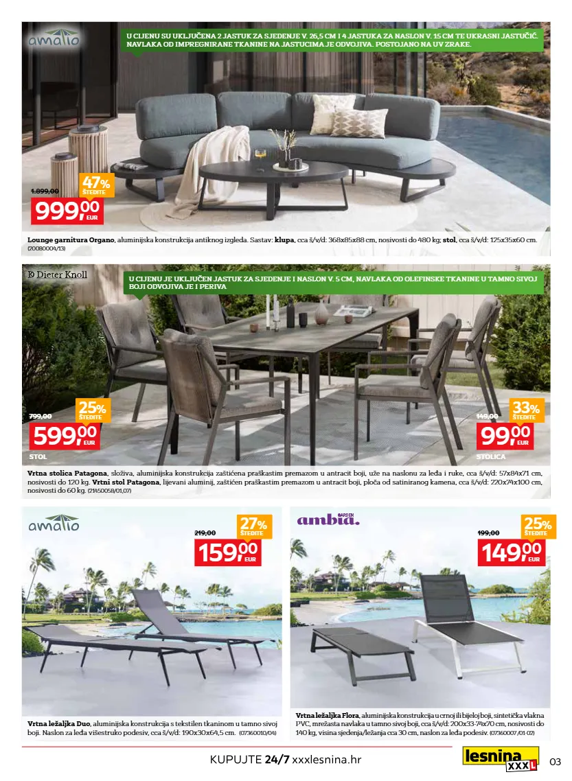 02 @lesnina xxxl hrvatska @lesninaxxxlhrvatska @lesninaxxxl @lesnina_xxxl_hr @lesnina_xxxl_hr lounge vrtni set willis , aluminijska konstrukcija zaštićena praškastim premazom u bež boji, jastuci punjeni pjenom s navlakom od impregnirane tekstilen tkanine s odvojivom navlakom. lounge garnitura willis , lijevi ili desni kut. sastav: stol, s pločom od esg kaljenog stakla u izgledu staklokeramike, cca š/v/d: 110x36x60 cm, nosivosti do 30 kg; dvije klupe , cca š/v/d: 158x60x90 cm, nosivosti do 360 kg, cca š/v/d: 180x60x90 cm, nosivosti do 360 kg. lounge fotelja willis , s jastukom za sjedenje i naslon, cca š/v/d: 76x60x90 cm, nosivosti do 120 kg. (07610021/79,89,21) u cijenu su uključena 2 jastuka za sjedenje i naslon v. 12 cm i 5 ukrasnih jastučića s odvojivom navlakom u cijenu su uključena 3 jastuka za sjedenje, 3 jastuka za naslon v. 8 cm i 3 ukrasna jastučića. navlaka na jastucima od olefinske impregnirane tkanine, odvojiva je i periva lounge garnitura cicia , aluminijska konstrukcija zaštićena praškastim premazom u boji bjelokosti. užad na sjedištu i naslonu u natur boji. jastuci u svijetloj bež boji. sastav: klupa , cca š/v/d: 178x86x82 cm, nosivosti do 240 kg; 2 fotelje , cca š/v/d: 85x86x82 cm, nosivosti do 120 kg. lounge stol cicia , lijevani aluminij, zaštićen praškastim premazom u boji bjelokosti, porculanska ploča u dekoru kamena, cca š/v/d: 120x38x60 cm, nosivosti do 30 kg. (10310015/09,07) vrtni set , konstrukcija od plastificiranog aluminija u antracit boji. vrtni stol beida , s keramičkom pločom u dekoru kamena sive boje, cca š/v/d: 180x75x90 cm, nosivosti do 60 kg. vrtna stolica hela grey j2288 , uže u boho stilu od poliesterskih vlakana, cca š/v/d: 55x85x62 cm, nosivosti do 120 kg. (21060007/07;0008/01) 329, 00 eur 469,00 stol 29 % štedite 99, 00 eur 149,00 stolica 33 % štedite 999, 00 eur 1.499,00 vrtni set 33 % štedite 119, 00 eur 179,00 lounge stol 33 % štedite 990, 00 eur 1.299,00 lounge garnitura 23 % štedite 259, 00 eur 349,00 lounge fotelja 25 % štedite