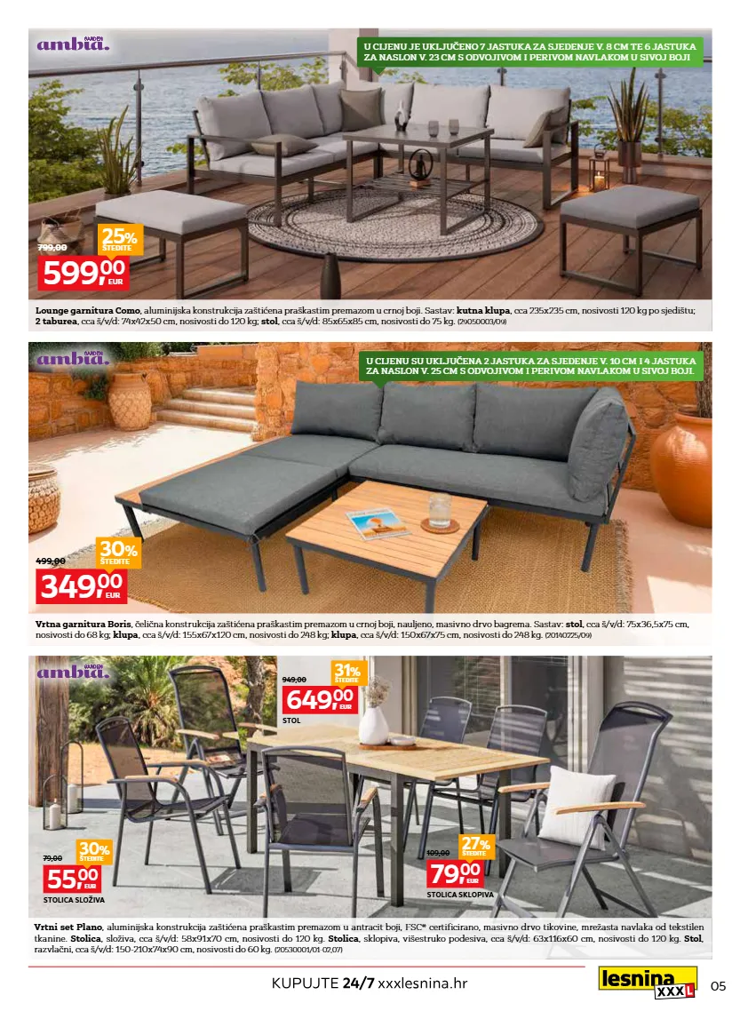 vrtni set pinada , aluminijska konstrukcija zaštićena praškastim premazom u bež boji. sastav: stol , cca š/v/d: 64,5x43x107,5 cm, nosivosti do 30 kg; trosjedna klupa , cca š/v/d: 200x80x88 cm, nosivosti do 360 kg; dvije fotelje , 72x80x88 cm, nosivosti do 120 kg. (06210010/09) oaza za opuštanje kreirajmo dom zajedno vrtna ležaljka catania , aluminijska konstrukcija zaštićena praškastim premazom u kombinaciji s tekstilen tkaninom, cca š/v/d: 70x37-105x140 cm, nosivosti do 120 kg. dostupna u dvije kombinacije boja: antracit okvir/tamno siva tkanina i srebrni okvir/ crno siva tkanina. naslon za leđa višestruko podesiv. (26720121/01-02) 99, 00 eur 159,00 37 % štedite vrtna stolica alexa , čelična konstrukcija zaštićena praškastim premazom/ tekstilen mrežasta tkanina, cca š/v/d: 54x93x74 cm, nosivosti do 120 kg. dostupna u boji: antracit/crna ili srebrna/siva. (18070015/01,11) 19, 90 eur trajno cijena niska 749, 00 eur 999,00 25 % štedite u cijenu je uključeno 5 jastuka za sjedenje v. 12 cm i 5 jastuka za naslon v. 8 cm u nježno rozoj boji. navlaka na jastucima je od olefinske tkanine, skidiva je i periva. 20 % xxxl popust* vrtni namještaj *ne vrijedi za akcijske i već snižene proizvode, “trajno niske cijene“ i online only. vrijedi za korisnike lesnina xxxl kartice.