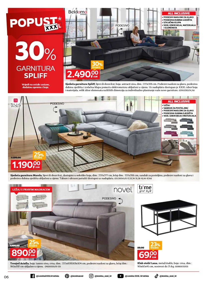 06 @lesnina xxxl hrvatska @lesninaxxxlhrvatska @lesninaxxxl @lesnina_xxxl_hr @lesnina_xxxl_hr klub stolić lana , metal/staklo, boja: crna, dim.: 90x60x45 cm, nosivost do 25 kg. (10880037/02) p podesivi nasloni za glavu p podesiva dubina sjedišta p izvlačna klupa p xxxl izbor boja, materijala i elemenata all inclusive p ležaj p sanduk za posteljinu p podesivi nasloni za glavu p podesiva dubina sjedišta p xxxl izbor boja i materijala all inclusive sjedeća garnitura spliff , lijevi ili desni kut, boja: antracit siva, dim.: 222x326 cm. podesivi nasloni za glavu, podesiva dubina sjedišta i izvlačna klupa pomoću elektromotora uključeni u cijenu. uz nadoplatu dostupan je xxxl izbor boja i materijala, velik izbor elemenata različitih dimenzija za individualno planiranje vaše nove garniture. (02450310/34,39) popust * 30 % garnitura spliff vrijedi na ostale sastave, dodatnu opremu i boje. podesivo podesivo sjedeća garnitura marola , lijevi ili desni kut, dostupno u nekoliko boja, dim.: 237x277 cm, ležaj dim.: 137x206 cm, sanduk za posteljinu, podesivi nasloni za glavu i podesiva dubina sjedišta uključeni u cijenu. tabure i ukrasni jastučić dostupni uz nadoplatu. (05530095/11-12,32,34-35,38-41,44-47,49) 1.190, 00 eur 1.599,00 25 % štedite 2.490, 00 eur 3.561,00 30 % štedite trosjed ariella , boja: tamno siva, crna, dim.: 222x83(100)x104 cm, podesivi nasloni za glavu, ležaj dim.: 160x192 cm uključen u cijenu. (24100001/01-02) 890, 00 eur 1.199,00 25 % štedite 69, 00 eur 89,90 23 % štedite podesivo ležaj s pravim madracem