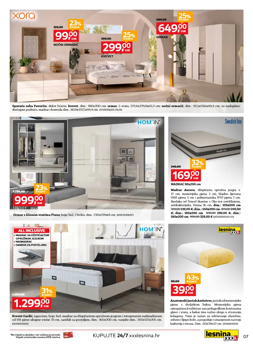 07 anatomski jastuk antistres , jastuk od memorijske pjene s dodatkom bakra. memorijska pjena omogućava kvalitetan san prilagodbom konturama glave i vrata, a bakar ima važnu ulogu u stvaranju kolagena. time je važan za održavanje elastične, zdrave i lijepe kože, a pogoduje i smanjenom razvoju bakterija i virusa. dim.: 60x39x12 cm. (20310017/01) spavaća soba favorita , dekor hrasta, krevet , dim.: 180x200 cm; ormar , 5 vrata, 222,6x229,8x63,3 cm; noćni ormarić , dim.: 42,5x59,6x40,4 cm; uz nadoplatu dostupne podnice, madrac i komoda dim.: 80,9x137,2x44,4 cm. (25930136/03-04,01) ormar s kliznim vratima piano , boja: bež, 2-krilni, dim.: 230x224x61 cm. (001c0008/1f) krevet caribi , tapeciran, boja: bež, madrac sa džepićastom opružnom jezgrom i integriranim nadmadracem od hr pjene ukupne visine 33 cm, sanduk za posteljinu, dim.: 160x200 cm, vanjske dim.: 202x122x205 cm. (00340037/01) p madrac sa džepićastom opružnom jezgrom p nadmadrac p sanduk za posteljinu all inclusive *ne vrijedi za akcijske i već snižene proizvode. vrijedi za korisnike lesnina xxxl kartice. ćććžtttž xxxl card 99, 00 eur 129,00 noćni ormarić 23 % štedite 299, 00 eur 399,00 krevet 25 % štedite 649, 00 eur 869,00 ormar 25 % štedite 999, 00 eur 1.299,00 23 % štedite 1.299, 00 eur 1.899,00 31 % štedite 39, 00 eur 69,00 43 % štedite madrac aurora , džepićasta opružna jezgra v. 17 cm, memorijska pjena 2 cm, hladno lijevana (hr) pjena 3 cm i poliuretanska (pu) pjena 2 cm. navlaka od tencel tkanine s öko-tex certifikatom, antibakterijska. visina 26 cm, dim.: 120x200 cm 329,00 219,00 €; dim.: 140x200 cm 379,00 249,00 €; dim.: 160x200 cm 439,00 299,00 €; dim.: 180x200 cm 499,00 329,00 € (002d0002/01-05) 169, 00 eur 249,00 madrac 90x200 cm 32 % štedite
