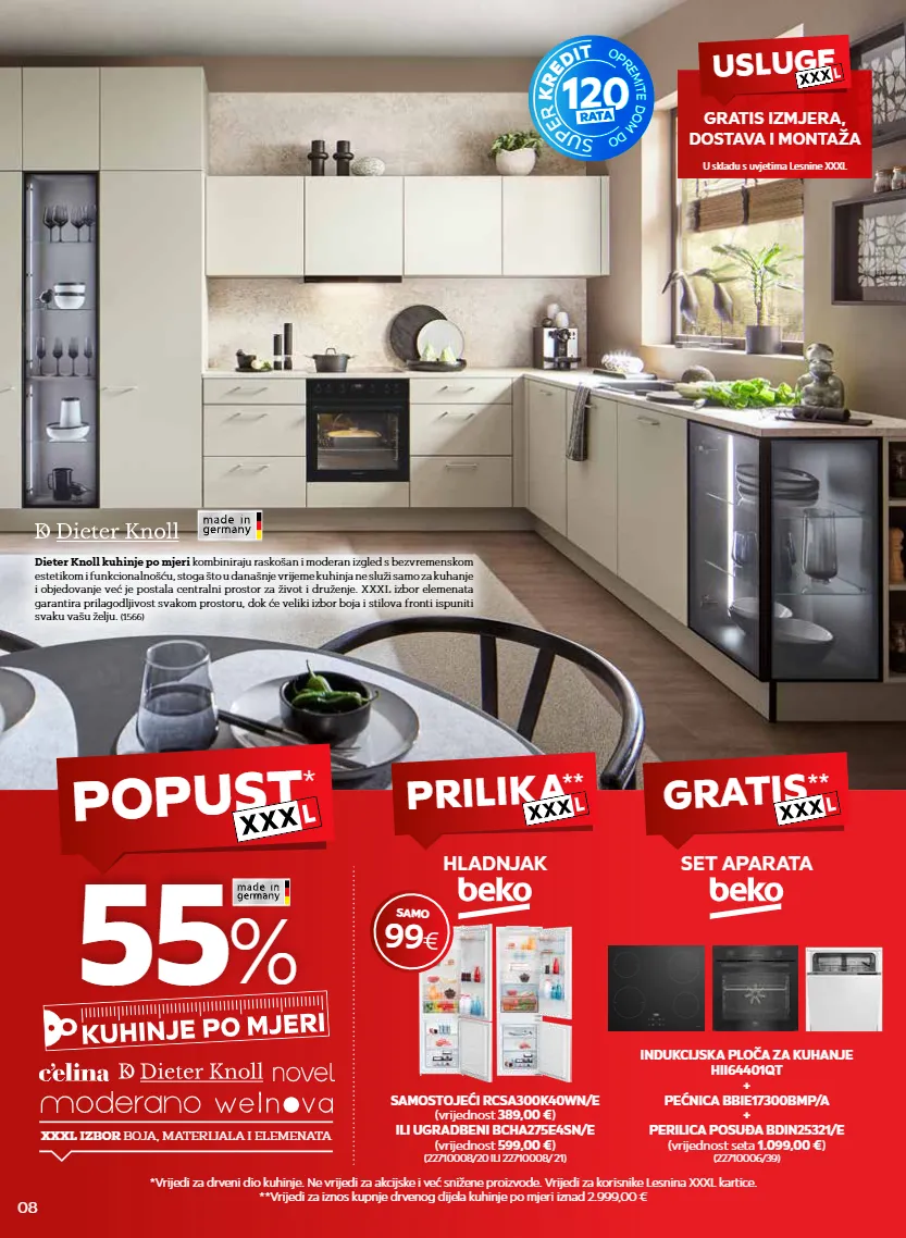 dieter knoll kuhinje po mjeri kombiniraju raskošan i moderan izgled s bezvremenskom estetikom i funkcionalnošću, stoga što u današnje vrijeme kuhinja ne služi samo za kuhanje i objedovanje već je postala centralni prostor za život i druženje. xxxl izbor elemenata garantira prilagodljivost svakom prostoru, dok će veliki izbor boja i stilova fronti ispuniti svaku vašu želju. (1566) popust * *vrijedi za drveni dio kuhinje. ne vrijedi za akcijske i već snižene proizvode. vrijedi za korisnike lesnina xxxl kartice. **vrijedi za iznos kupnje drvenog dijela kuhinje po mjeri iznad 2.999,00 € 55 % xxxl izbor boja, materijala i elemenata 08 120 rata o p r e m i t e d o m d o s u p e r k r e d i t usluge gratis izmjera, dostava i montaža u skladu s uvjetima lesnine xxxl prilika ** samostojeći rcsa300k40wn/e (vrijednost 389,00 € ) ili ugradbeni bcha275e4sn/e (vrijednost 599,00 € ) (22710008/20 ili 22710008/ 21) hladnjak samo 99 € gratis ** indukcijska ploča za kuhanje hii64401qt + pećnica bbie17300bmp/a + perilica posuđa bdin25321/e (vrijednost seta 1.099,00 € ) (22710006/39) set aparata