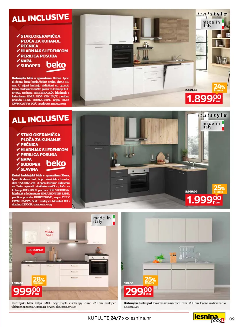 09 kuhinjski blok spot , boja: kašmir/antracit, dim.: 200 cm. cijena za drveni dio. (05860123/01) all inclusive kuhinjski blok s aparatima dafne , lijevi ili desni, boja: bijela/dekor oraha, dim.: 315 cm. u cijeni kuhinje uključeni su aparati beko: staklokeramička ploča za kuhanje hic 64401, pećnica bbie13100x/a, hladnjak s ledenicom bdsa 2504 ksn lh/e, perilica posuđa beko bdin25320/e, napa tilly cwm cappa 60/c i sudoper. (11630037/06) p staklokeramička ploča za kuhanje p pećnica p hladnjak s ledenicom p perilica posuđa p napa p sudoper 1.899, 00 eur 2.499,00 24 % štedite made in italy made in italy made in italy all inclusive kutni kuhinjski blok s aparatima flora , lijevi ili desni kut, boja: siva/dekor hrasta, dim.: 270x165 cm. u cijeni kuhinje uključeni su beko aparati: staklokeramička ploča za kuhanje hic 64401, pećnica bbic14000x/a, hladnjak s ledenicom bdsa2504ksn lh/e, perilica posuđa bdin25320/e, napa tilly cwm cappa 60/c, sudoper mondial 80 i slavina 1370cr. (11630057/04-05) p staklokeramička ploča za kuhanje p pećnica p hladnjak s ledenicom p perilica posuđa p napa p sudoper p slavina 1.999, 00 eur 2.699,00 25 % štedite 999, 00 eur 1.399,00 28 % štedite sudoper kuhinjski blok katja , mdf, boja: bijela visoki sjaj, dim.: 270 cm, sudoper uključen u cijenu. cijena za drveni dio. (11630073/02) 299, 00 eur 399,00 25 % štedite visoki sjaj