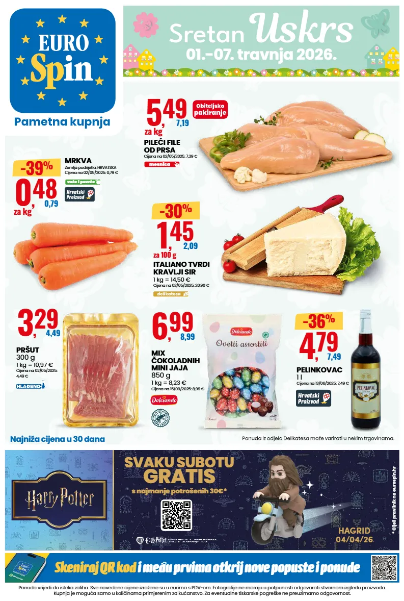 * cijeli pravilnik na eurospin.hr s najmanje potrošenih 30€* svaku subotu gratis hagrid 04/04/26 ponuda vrijedi do isteka zaliha. sve navedene cijene izražene su u eurima s pdv-om. fotografije ne moraju u potpunosti odgovarati stvarnom izgledu proizvoda. kupnja je moguća samo u količinama primjerenim za kućanstvo. za eventualne tiskarske pogreške ne preuzimamo odgovornost. skeniraj qr kod i među prvima otkrij nove popuste i ponude 01.-07. travnja 2026. najniža cijena u 30 dana pileći file od prsa cijena na 02/05/2025: 7,39 € 5 , 49 7,19 za kg mesnica pršut 300 g 1 kg = 10,97 € cijena na 02/05/2025: 4,49 € 3 , 29 4,49 mix čokoladnih mini jaja 850 g 1 kg = 8,23 € cijena na 15/09/2025: 8,99 € 6 , 99 8,99 pelinkovac 1 l cijena na 13/06/2025: 7,49 € 4 , 79 7,49 -36 % italiano tvrdi kravlji sir 1 kg = 14,50 € cijena na 02/05/2025: 20,90 € 1 , 45 2,09 za 100 g -30 % mrkva zemlja podrijetla: hrvatska cijena na 02/05/2025: 0,79 € 0 , 48 0,79 za kg voće i povrće -39 %