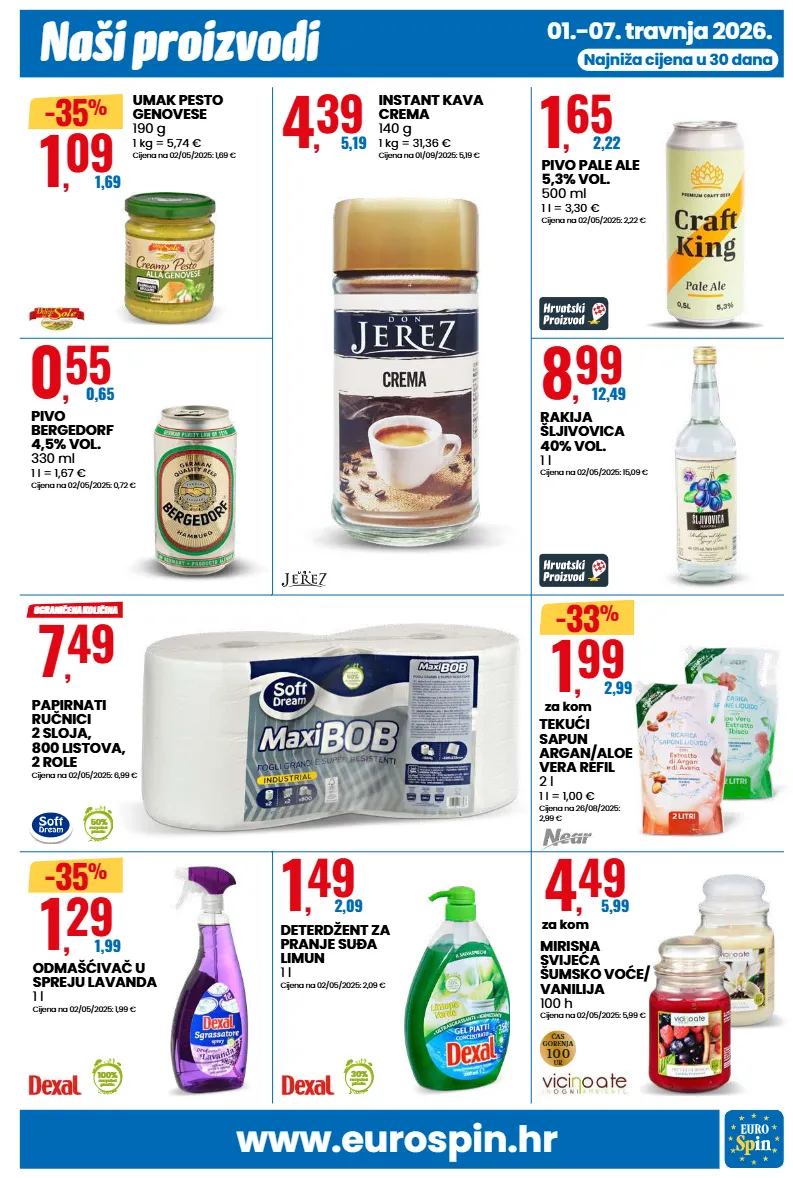 www.eurospin.hr naši proizvodi 01.-07. travnja 2026. najniža cijena u 30 dana 1 , 09 1,69 -35 % umak pesto genovese 190 g 1 kg = 5,74 € cijena na 02/05/2025: 1,69 € 4 , 39 5,19 instant kava crema 140 g 1 kg = 31,36 € cijena na 01/09/2025: 5,19 € 1 , 65 2,22 pivo pale ale 5,3% vol. 500 ml 1 l = 3,30 € cijena na 02/05/2025: 2,22 € 0 , 55 0,65 pivo bergedorf 4,5% vol. 330 ml 1 l = 1,67 € cijena na 02/05/2025: 0,72 € 8 , 99 12,49 rakija šljivovica 40% vol. 1 l cijena na 02/05/2025: 15,09 € 1 , 99 2,99 za kom -33 % tekući sapun argan/aloe vera refil 2 l 1 l = 1,00 € cijena na 26/08/2025: 2,99 € 1 , 49 2,09 30% recycled plastic deterdžent za pranje suða limun 1 l cijena na 02/05/2025: 2,09 € 1 , 29 1,99 100% recycled plastic -35 % odmašćivač u spreju lavanda 1 l cijena na 02/05/2025: 1,99 € 4 , 49 5,99 za kom čas gorenja ur 100 mirisna svijeća šumsko voće/ vanilija 100 h cijena na 02/05/2025: 5,99 € 7 , 49 50% recycled plastic ograničena količina papirnati ručnici 2 sloja, 800 listova, 2 role cijena na 02/05/2025: 6,99 €