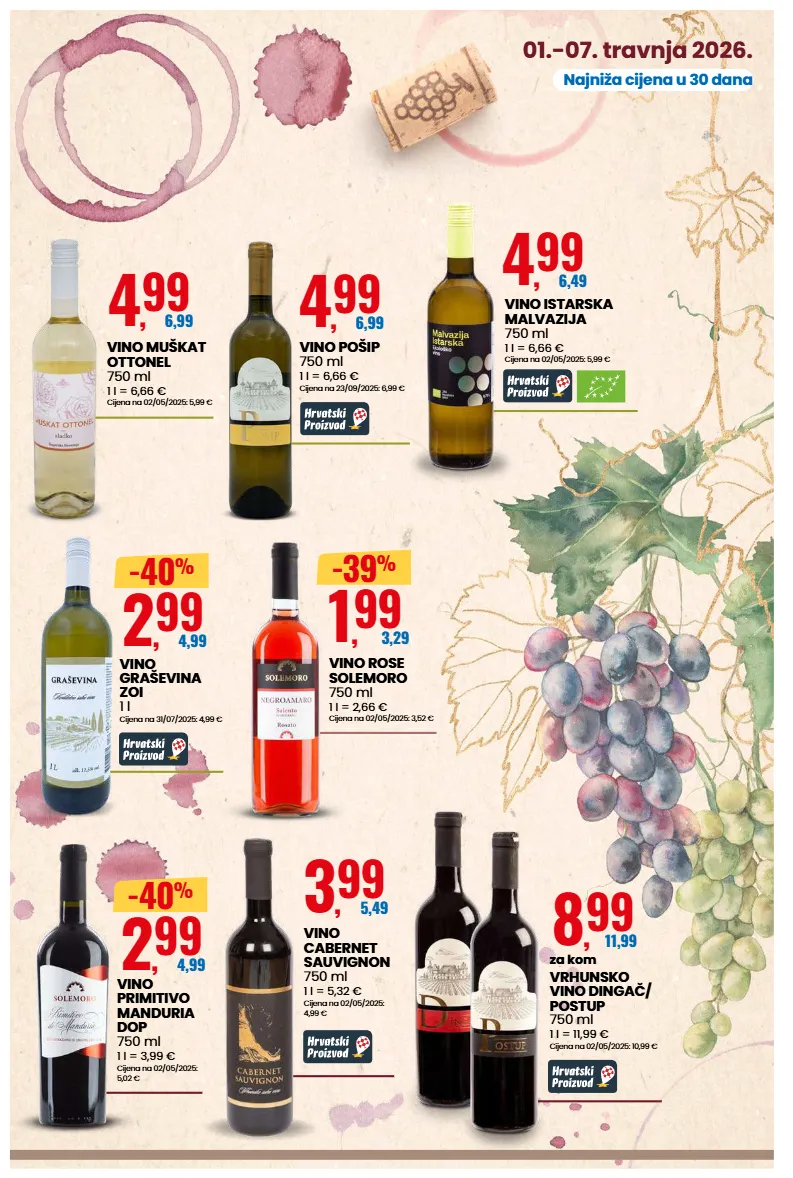 01.-07. travnja 2026. najniža cijena u 30 dana 4 , 99 6,49 vino istarska malvazija 750 ml 1 l = 6,66 € cijena na 02/05/2025: 5,99 € 4 , 99 6,99 vino muškat ottonel 750 ml 1 l = 6,66 € cijena na 02/05/2025: 5,99 € 1 , 99 3,29 -39 % vino rose solemoro 750 ml 1 l = 2,66 € cijena na 02/05/2025: 3,52 € 3 , 99 5,49 vino cabernet sauvignon 750 ml 1 l = 5,32 € cijena na 02/05/2025: 4,99 € 2 , 99 4,99 -40 % vino primitivo manduria dop 750 ml 1 l = 3,99 € cijena na 02/05/2025: 5,02 € 8 , 99 11,99 za kom vrhunsko vino dingač/ postup 750 ml 1 l = 11,99 € cijena na 02/05/2025: 10,99 € 2 , 99 4,99 -40 % vino graševina zoi 1 l cijena na 31/07/2025: 4,99 € 4 , 99 6,99 vino pošip 750 ml 1 l = 6,66 € cijena na 23/09/2025: 6,99 €