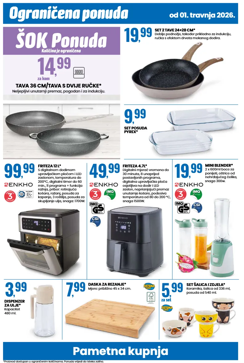 pametna kupnja ograničena ponuda *proizvod dostupan u ograničenim količinama. ponuda vrijedi do isteka zaliha. od 01. travnja 2026. tava 36 cm/tava s dvije ručke* neljepljivi unutarnji premaz, pogodan i za indukciju. 14 , 99 za kom set 2 tave 24+28 cm* deblje podnožje, također prikladno za indukciju, ručka s efektom drveta mekanog dodira. 19 , 99 set posuda pyrex* 9 , 99 dispenzer za ulje* kapacitet 480 ml. 3 , 99 daska za rezanje* mjere: približno 45 x 34 cm. 7 , 99 set šalica i zdjela* keramika, šalica od 336 ml, posuda od 540 ml. 5 , 99 za set friteza 12 l* s digitalnom dodirnom upravljačkom pločom i led zaslonom, temperatura do 200°c, digitalni timer do 60 min., 11 programa + funkcija ražnja, pribor: rotirajuća košara, ražanj, posuda za kapanje, 3 roštilja, posuda za skupljanje ulja, snaga: 1700w. 99 , 99 friteza 4.7l* digitalni mjerač vremena do 30 minuta, 8 unaprijed postavljenih programa, digitalna upravljačka ploča osjetljiva na dodir i led zaslon, neprianjajući premaz unutarnje košare, podesiva temperatura od 80 do 200 °c, snaga 1500w. 49 , 99 mini blender* 2 x 600ml boce za ponijeti, oštrice od nehrđajućeg čelika, snaga 300w. 19 , 99