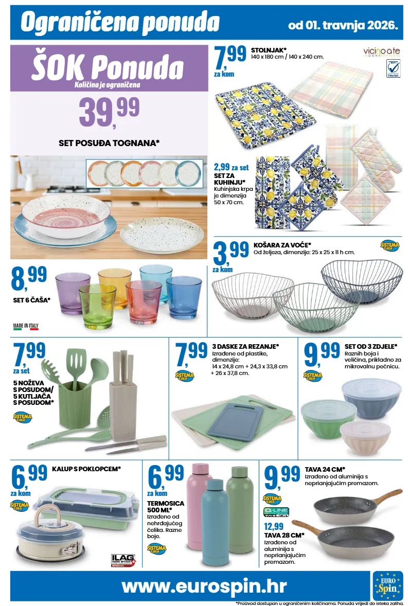www.eurospin.hr ograničena ponuda *proizvod dostupan u ograničenim količinama. ponuda vrijedi do isteka zaliha. od 01. travnja 2026. set posuđa tognana* 39 , 99 stolnjak* 140 x 180 cm / 140 x 240 cm. 7 , 99 za kom set 6 čaša* 8 , 99 tava 24 cm* izrađeno od aluminija s neprianjajućim premazom. 9 , 99 12,99 tava 28 cm* izrađeno od aluminija s neprianjajućim premazom. 3 daske za rezanje* izrađene od plastike, dimenzije: 14 x 24,8 cm + 24,3 x 33,8 cm + 26 x 37,8 cm. 7 , 99 košara za voće* od željeza, dimenzije: 25 x 25 x 11 h cm. 3 , 99 za kom 5 noževa s posudom/ 5 kutljača s posudom* 7 , 99 za set 9 , 99 set od 3 zdjele* raznih boja i veličina, prikladno za mikrovalnu pećnicu. 6 , 99 za kom kalup s poklopcem* termosica 500 ml* izrađeno od nehrđajućeg čelika. razne boje. 6 , 99 za kom 2,99 za set set za kuhinju* kuhinjska krpa je dimenzija 50 x 70 cm.