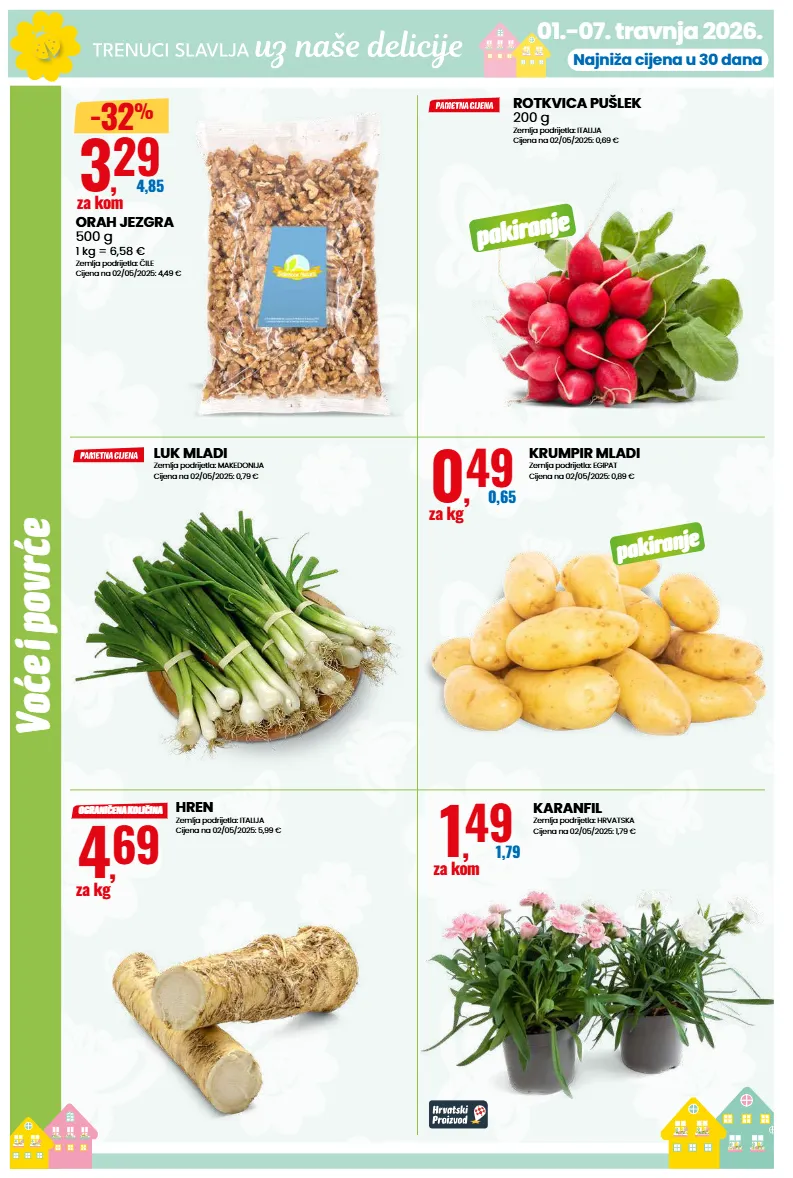 voće i povrće 01.-07. travnja 2026. najniža cijena u 30 dana rotkvica pušlek 200 g zemlja podrijetla: italija cijena na 02/05/2025: 0,69 € pakiranje luk mladi zemlja podrijetla: makedonija cijena na 02/05/2025: 0,79 € krumpir mladi zemlja podrijetla: egipat cijena na 02/05/2025: 0,89 € pakiranje 0 , 49 0,65 za kg hren zemlja podrijetla: italija cijena na 02/05/2025: 5,99 € 4 , 69 za kg ograničena količina orah jezgra 500 g 1 kg = 6,58 € zemlja podrijetla: čile cijena na 02/05/2025: 4,49 € 3 , 29 4,85 za kom -32 % karanfil zemlja podrijetla: hrvatska cijena na 02/05/2025: 1,79 € 1 , 49 1,79 za kom