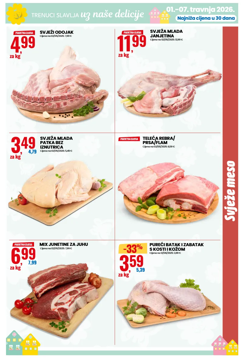 svježe meso 01.-07. travnja 2026. najniža cijena u 30 dana svježi odojak cijena na 02/05/2025: 7,99 € 4 , 99 za kg svježa mlada janjetina cijena na 02/05/2025: 12,99 € 11 , 99 za kg svježa mlada patka bez iznutrica cijena na 02/05/2025: 5,49 € 3 , 49 4,79 za kg teleća rebra/ prsa/flam cijena na 02/05/2025: 8,59 € mix junetine za juhu cijena na 02/05/2025: 7,99 € 6 , 99 7,99 za kg pureći batak i zabatak s kosti i kožom cijena na 12/06/2025: 3,99 € 3 , 59 5,39 za kg -33 %