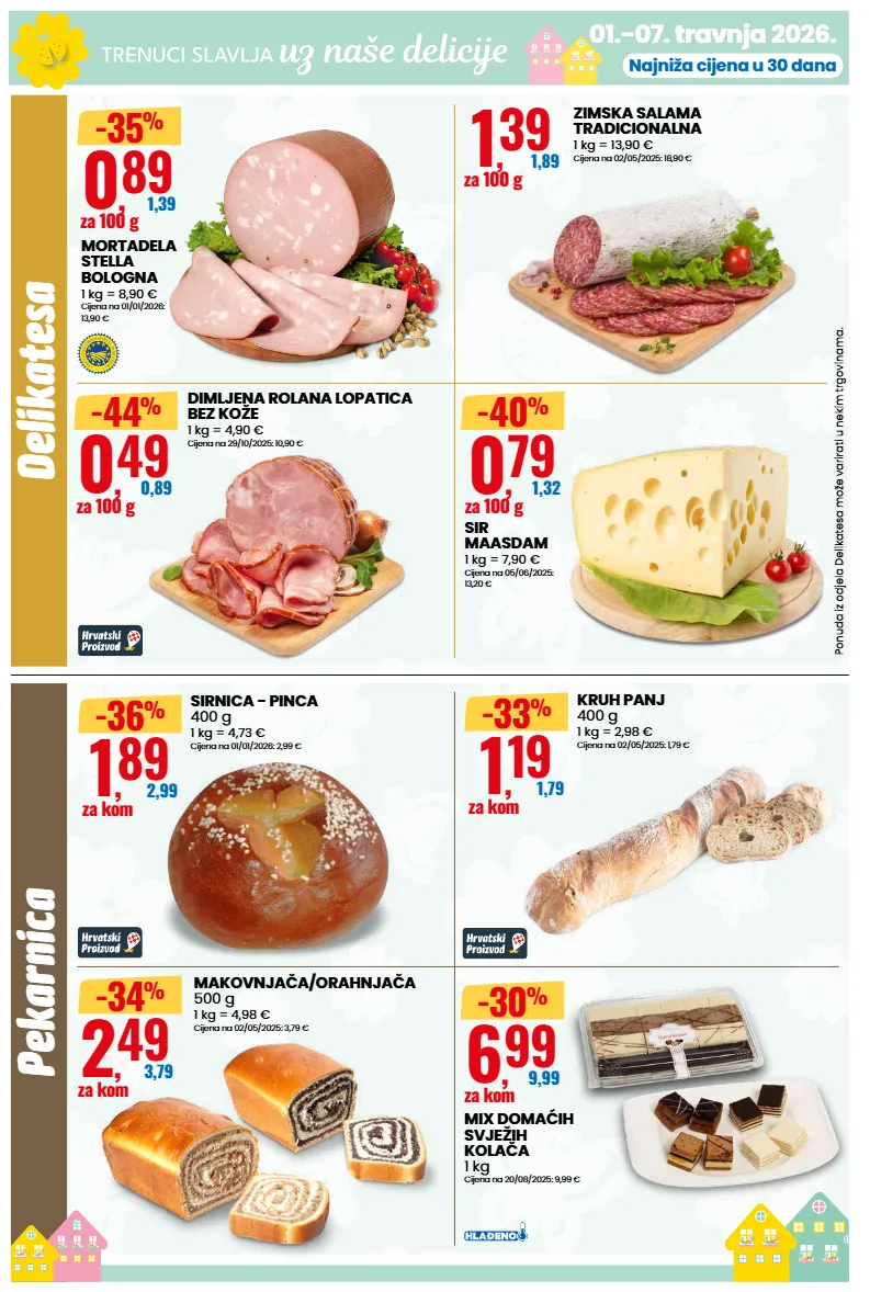 pekarnica 01.-07. travnja 2026. delikatesa ponuda iz odjela delikatesa može varirati u nekim trgovinama. najniža cijena u 30 dana zimska salama tradicionalna 1 kg = 13,90 € cijena na 02/05/2025: 18,90 € 1 , 39 1,89 za 100 g mix domaćih svježih kolača 1 kg cijena na 20/08/2025: 9,99 € 6 , 99 9,99 za kom dimljena rolana lopatica bez kože 1 kg = 4,90 € cijena na 29/10/2025: 10,90 € 0 , 49 0,89 za 100 g -44 % sir maasdam 1 kg = 7,90 € cijena na 05/06/2025: 13,20 € 0 , 79 1,32 za 100 g -40 % sirnica - pinca 400 g 1 kg = 4,73 € cijena na 01/01/2026: 2,99 € 1 , 89 2,99 za kom -36 % kruh panj 400 g 1 kg = 2,98 € cijena na 02/05/2025: 1,79 € 1 , 19 1,79 za kom -33 % makovnjača/orahnjača 500 g 1 kg = 4,98 € cijena na 02/05/2025: 3,79 € 2 , 49 3,79 za kom -34 % mortadela stella bologna 1 kg = 8,90 € cijena na 01/01/2026: 13,90 € • p r o t e c t e d g e o g r a p h i c a l i n d i c a t i o n • 0 , 89 1,39 za 100 g -35 % -30 %