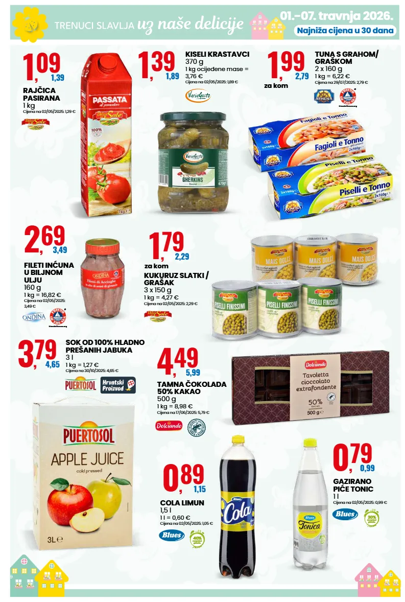 01.-07. travnja 2026. najniža cijena u 30 dana 1 , 09 1,39 rajčica pasirana 1 kg cijena na 02/05/2025: 1,29 € 1 , 39 1,89 kiseli krastavci 370 g 1 kg ocijeđene mase = 3,76 € cijena na 02/05/2025: 1,89 € 1 , 99 2,79 za kom friendofthesea.org tuna s grahom/ graškom 2 x 160 g 1 kg = 6,22 € cijena na 29/07/2025: 2,79 € 1 , 79 2,29 za kom kukuruz slatki / grašak 3 x 150 g 1 kg = 4,27 € cijena na 02/05/2025: 2,29 € 0 , 89 1,15 40% recycled plastic cola limun 1,5 l 1 l = 0,60 € cijena na 02/05/2025: 1,05 € 0 , 79 0,99 30% recycled plastic gazirano piće tonic 1 l cijena na 02/05/2025: 0,99 € 4 , 49 5,99 tamna čokolada 50% kakao 500 g 1 kg = 8,98 € cijena na 17/06/2025: 5,79 € 3 , 79 4,65 sok od 100% hladno prešanih jabuka 3 l 1 kg = 1,27 € cijena na 30/10/2025: 4,65 € 2 , 69 3,49 friendofthesea.org fileti inćuna u biljnom ulju 160 g 1 kg = 16,82 € cijena na 02/05/2025: 3,49 €
