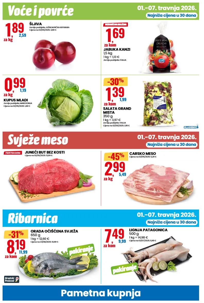 voće i povrće 01.-07. travnja 2026. pametna kupnja svježe meso 01.-07. travnja 2026. najniža cijena u 30 dana najniža cijena u 30 dana ribarnica 01.-07. travnja 2026. juneći but bez kosti cijena na 02/05/2025: 13,99 € carsko meso cijena na 02/05/2025: 5,29 € 2 , 99 5,49 za kg lignja patagonica 500 g 1 kg = 14,98 € cijena na 03/07/2025: 8,49 € pakiranje 7 , 49 9,99 za kom najniža cijena u 30 dana -45 % pakiranje orada očišćena svježa 650 g 1 kg = 12,60 € cijena na 23/08/2025: 10,99 € 8 , 19 11,99 za kom -31 % šljiva zemlja podrijetla: južnoafrička republika cijena na 02/05/2025: 3,69 € 1 , 89 2,59 za kg kupus mladi zemlja podrijetla: makedonija cijena na 02/05/2025: 1,49 € 0 , 99 1,19 za kg salata grand mista 350 g 1 kg = 3,97 € zemlja podrijetla: italija cijena na 02/05/2025: 1,99 € 1 , 39 1,99 za kom -30 % jabuka kanzi 1,5 kg 1 kg = 1,13 € zemlja podrijetla: italija 1 , 69 za kom ograničena količina