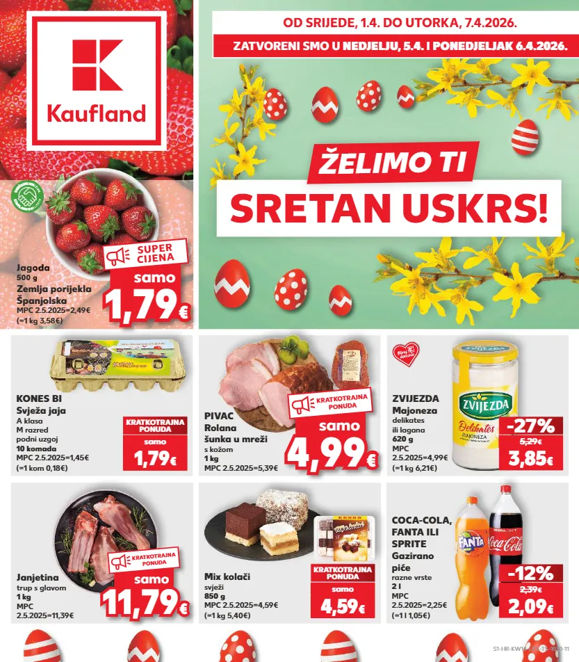 kratkotrajna ponuda kratkotrajna ponuda samo samo samo samo od srijede, 1.4. do utorka, 7.4.2026. zatvoreni smo u nedjelju, 5.4. i ponedjeljak 6.4.2026. zvijezda majoneza delikates ili lagana 620 g mpc 2.5.2025=4,99€ (=1 kg 6,21€) janjetina trup s glavom 1 kg mpc 2.5.2025=11,39€ coca-cola, fanta ili sprite gazirano piće razne vrste 2 l mpc 2.5.2025=2,25€ (=1 l 1,05€) -27% -12% kratkotrajna ponuda 1,79 € (=1 kom 0,18€) kones bi svježa jaja a klasa m razred podni uzgoj 10 komada mpc 2.5.2025=1,45€ kratkotrajna ponuda 3,85 € 5,29 € 2,09 € 2,39 € pivac rolana šunka u mreži s kožom 1 kg mpc 2.5.2025=5,39€ samo 4,59 € samo (=1 kg 5,40€) mix kolači svježi 850 g mpc 2.5.2025=4,59€ jagoda 500 g zemlja porijekla španjolska mpc 2.5.2025=2,49€ (=1 kg 3,58€) k a u f l a n d k v a l i t e t a o b e ć a n j e s v j e ž i n e jagoda 500 g a l i t e t a t e ž i n e jagoda sretan uskrs! sretan uskrs! želimo ti 1,7 9 1,79 € € samo super cijena 11,7 9 11,79 € € samo kratkotrajna ponuda 4,99 4,99 € € samo kratkotrajna ponuda s1-hr-kw14-lft-ts-1030-11