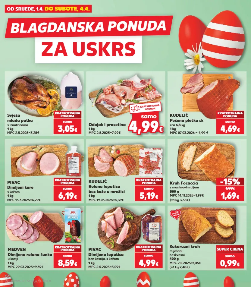kratkotrajna ponuda samo kratkotrajna ponuda od srijede, 1.4. do subote, 4.4. odojak i prasetina 1 kg mpc 2.5.2025=7,99€ svježa mlada patka s iznutricama 1 kg mpc 2.5.2025=3,25€ kudelić pečena plećka sk cca 6,8 kg 1 kg mpc 07.03.2026.= 4,99 € kudelić rolana lopatica bez kože u mrežici 1 kg mpc 19.03.2025=5,39€ kruh focaccia s maslinovim uljem 500 g mpc 14.11.2025=1,99€ (=1 kg 3,38€) pivac dimljeni kare s kožom 1 kg mpc 13.3.2025=6,29€ kratkotrajna ponuda kratkotrajna ponuda kratkotrajna ponuda kratkotrajna ponuda -15% kratkotrajna ponuda pivac dimljena lopatica bez kostiju, s kožom 1 kg mpc 2.5.2025=5,09€ samo 3,05 € samo 4,69 € samo 5,19 € samo 6,19 € 1,69 € 1,99 € kukuruzni kruh miješani beskvasni 400 g mpc 2.5.2025=1,45€ (=1 kg 2,48€) super cijena samo 0,99 € samo 4,99 € medven dimljena rolana šunka u kutiji 1 kg mpc 29.03.2025=9,39€ kratkotrajna ponuda samo 8,59 € za uskrs blagdanska ponuda 4,99 4,99 € € samo kratkotrajna ponuda s12-hr-kw14-lft-aktf1_6_1_l-1030-11 12