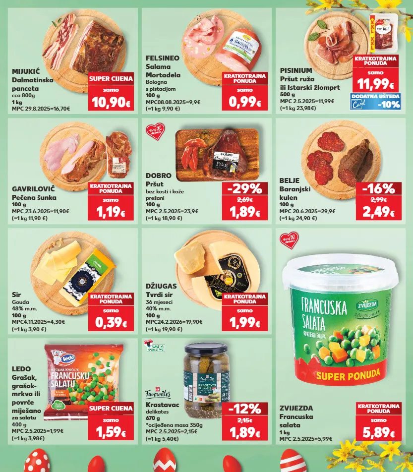 kratkotrajna ponuda kratkotrajna ponuda kratkotrajna ponuda samo kratkotrajna ponuda samo kratkotrajna ponuda samo ledo grašak, grašak- mrkva ili povrće miješano za salatu 400 g mpc 2.5.2025=1,99€ (=1 kg 3,98€) super cijena (=1 kg 9,90 €) felsineo salama mortadela bologna s pistacijom 100 g mpc08.08.2025=9,9€ kratkotrajna ponuda mijukić dalmatinska panceta cca 800g 1 kg mpc 29.8.2025=16,70€ super cijena samo 1,59 € sir gouda 48% m.m. 100 g mpc4.11.2025=4,30€ (=1 kg 3,90 €) kratkotrajna ponuda džiugas tvrdi sir 36 mjeseci 40% m.m. 100 g mpc24.2.2026=19,90€ (=1 kg 19,90 €) kratkotrajna ponuda samo 0,39 € samo 1,99 € gavrilović pečena šunka 100 g mpc 23.6.2025=11,90€ (=1 kg 11,90 €) dobro pršut bez kosti i kože prešani 100 g mpc 2.5.2025=23,9€ (=1 kg 18,90 €) kratkotrajna ponuda -29% samo 1,19 € 1,89 € 2,69 € belje baranjski kulen 100 g mpc 20.6.2025=29,9€ (=1 kg 24,90 €) -16% 2,49 € 2,99 € samo 0,99 € zvijezda francuska salata 1 kg mpc 2.5.2025=5,99€ kratkotrajna ponuda samo 5,89 € samo 10,90 € (=1 kg 23,98€) pisinium pršut ruža ili istarski žlomprt 500 g mpc 2.5.2025=11,99€ kratkotrajna ponuda samo 11,99 € -10% dodatna ušteda krastavac delikates 670 g *ocijeđena masa 350g mpc 2.5.2025=2,15€ (=1 kg 5,40€) -12% 1,89 € 2,15 € s13-hr-kw14-lft-aktf1_6_2_r-1030-11 13
