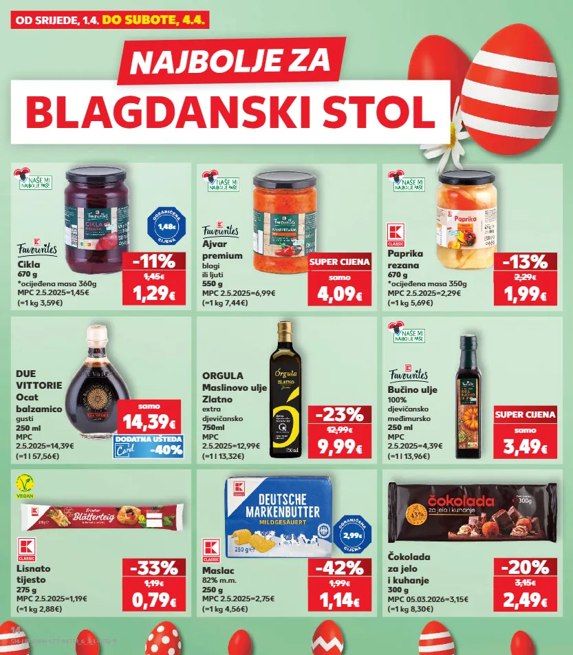 kratkotrajna ponuda kratkotrajna ponuda kratkotrajna ponuda kratkotrajna ponuda kratkotrajna ponuda samo samo samo kratkotrajna ponuda samo kratkotrajna ponuda samo kratkotrajna ponuda super cijena samo od srijede, 1.4. do subote, 4.4. ajvar premium blagi ili ljuti 550 g mpc 2.5.2025=6,99€ (=1 kg 7,44€) paprika rezana 670 g *ocijeđena masa 350g mpc 2.5.2025=2,29€ (=1 kg 5,69€) orgula maslinovo ulje zlatno extra djevičansko 750ml mpc 2.5.2025=12,99€ (=1 l 13,32€) bučino ulje 100% djevičansko međimursko 250 ml mpc 2.5.2025=4,39€ (=1 l 13,96€) super cijena -13% -23% super cijena -20% samo 4,09 € 1,99 € 2,29 € 9,99 € 12,99 € samo 3,49 € 2,49 € 3,15 € (=1 kg 8,30€) čokolada za jelo i kuhanje 300 g mpc 05.03.2026=3,15€ cikla 670 g *ocijeđena masa 360g mpc 2.5.2025=1,45€ (=1 kg 3,59€) -11% 1,29 € 1,45 € 1,48 € (=1 l 57,56€) due vittorie ocat balzamico gusti 250 ml mpc 2.5.2025=14,39€ samo 14,39 € -40% dodatna ušteda lisnato tijesto 275 g mpc 2.5.2025=1,19€ (=1 kg 2,88€) -33% 0,79 € 1,19 € maslac 82% m.m. 250 g mpc 2.5.2025=2,75€ (=1 kg 4,56€) -42% 1,14 € 1,99 € 2,99 € blagdanski stol najbolje za s14-hr-kw14-lft-aktf1_6_3_l-1030-11 14