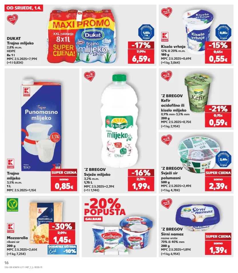 kratkotrajna ponuda kratkotrajna ponuda kratkotrajna ponuda kratkotrajna ponuda kratkotrajna ponuda kratkotrajna ponuda kratkotrajna ponuda samo kratkotrajna ponuda samo samo samo samo samo od srijede, 1.4. `z bregov svježi sir polumasni 500 g mpc 2.5.2025=2,49€ (=1 kg 4,78€) super cijena mozzarella ribani sir 200 g mpc 2.5.2025=2,65€ (=1 kg 7,25€) `z bregov sirni namaz razne vrste 70% ili 40% mm 200 g mpc 2.5.2025=1,89€ (=1 kg 6,95€) -30% super cijena (=1 l 1,14€) `z bregov svježe mlijeko 3,2% m.m. 1,75 l mpc 2.5.2025=2,39€ -16% (=1 l 0,83€) dukat trajno mlijeko 2,8% m.m. hdpe 8x 1 l mpc 2.5.2025=7,99€ -17% trajno mlijeko 3,5% m.m. 1 l mpc 2.5.2025=1,15€ super cijena `z bregov kefir acidofilno ili kiselo mlijeko 0,9% mm-3,5% mm 200 g mpc 2.5.2025=0,75€ (=1 kg 2,95€) -21% 0,59 € 0,75 € kiselo vrhnje 12% ili 20% m.m. 180 g mpc 2.5.2025=0,69€ (=1 kg 3,06€) -15% 0,55 € 0,65 € samo 2,39 € 1,45 € 2,09 € samo 1,39 € 1,99 € 2,39 € 6,59 € 7,99 € 0,85 € samo galbani -20% popusta 1,03 € / 1l 0,85 € 2,49 € -10% dodatna ušteda s16-hr-kw14-lft-mp_1_l-1030-11 16