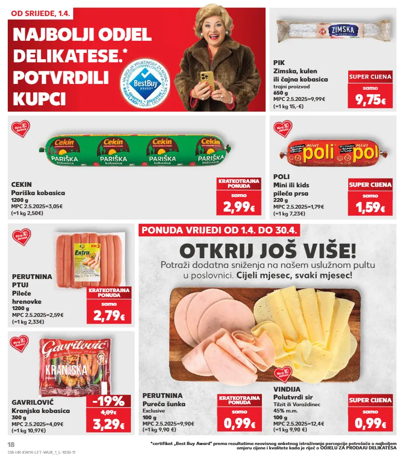 kratkotrajna ponuda kratkotrajna ponuda kratkotrajna ponuda samo samo samo samo samo samo *certifikat „best buy award“ prema rezultatima neovisnog anketnog istraživanja percepcije potrošača o najboljem omjeru cijene i kvalitete kada je riječ o odjelu za prodaju delikatesa od srijede, 1.4. potraži dodatna sniženja na našem uslužnom pultu u poslovnici. cijeli mjesec, svaki mjesec! ponuda vrijedi od 1.4. do 30.4. otkrij još više! u poslovnici. cijeli mjesec, svaki mjesec! perutnina ptuj pileće hrenovke 1200 g mpc 2.5.2025=2,59€ (=1 kg 2,33€) poli mini ili kids pileća prsa 220 g mpc 2.5.2025=1,79€ (=1 kg 7,23€) gavrilović kranjska kobasica 300 g mpc 2.5.2025=4,09€ (=1 kg 10,97€) perutnina pureća šunka exclusive 100 g mpc 2.5.2025=9,90€ (=1 kg 9,90 €) vindija polutvrdi sir tilzit ili varaždinec 45% m.m. 100 g mpc 2.5.2025=12,4€ (=1 kg 9,90 €) super cijena kratkotrajna ponuda -19% kratkotrajna ponuda super cijena kratkotrajna ponuda super cijena samo super cijena super cijena - - super cijena 23% super cijena 23% 23% super cijena 9,75 € (=1 kg 15,-€) pik zimska, kulen ili čajna kobasica trajni proizvod 650 g mpc 2.5.2025=9,99€ kratkotrajna ponuda 1,59 € samo 2,79 € samo 3,29 € 4,09 € 0,99 € samo 0,99 € samo o 12,79 samo 12,79 samo 12,7 samo 12,79 samo samo € o € o 2,99 € samo (=1 kg 2,50€) cekin pariška kobasica 1200 g mpc 2.5.2025=3,05€ najbolji odjel delikatese. * potvrdili kupci delikatese. s18-hr-kw14-lft-wuk_1_l-1030-11 18