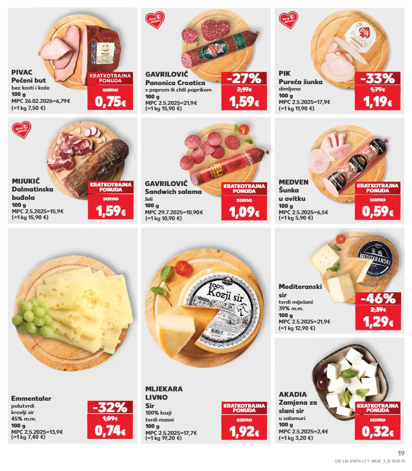 kratkotrajna ponuda kratkotrajna ponuda kratkotrajna ponuda samo samo samo kratkotrajna ponuda samo samo samo samo samo samo samo medven šunka u ovitku 100 g mpc 2.5.2025=6,5€ (=1 kg 5,90 €) emmentaler polutvrdi kravlji sir 45% m.m. 100 g mpc 2.5.2025=13,9€ (=1 kg 7,40 €) kratkotrajna ponuda gavrilović sandwich salama jeli 100 g mpc 29.7.2025=10,90€ (=1 kg 10,90 €) kratkotrajna ponuda -32% mljekara livno sir 100% kozji tvrdi masni 100 g mpc 2.5.2025=17,7€ (=1 kg 19,20 €) akadia zamjena za slani sir u salamuri 100 g mpc 2.5.2025=2,4€ (=1 kg 3,20 €) kratkotrajna ponuda kratkotrajna ponuda pivac pečeni but bez kosti i kože 100 g mpc 26.02.2026=6,79€ (=1 kg 7,50 €) kratkotrajna ponuda kratkotrajna ponuda super cijena kratkotrajna super cijena super cijena kratkotrajna ponuda super cijena super cijena ponuda (=1 kg 15,90 €) gavrilović panonica croatica s paprom ili chili paprikom 100 g mpc 2.5.2025=21,9€ -27% (=1 kg 15,90 €) mijukić dalmatinska buđola 100 g mpc 2.5.2025=15,9€ kratkotrajna ponuda (=1 kg 11,90 €) pik pureća šunka dimljena 100 g mpc 2.5.2025=17,9€ -33% 0,59 € samo 1,09 € samo 0,74 € 1,09 € mediteranski sir tvrdi miješani 39% m.m. 100 g mpc 2.5.2025=21,9€ (=1 kg 12,90 €) -46% 1,29 € 2,39 € 1,92 € samo 0,32 € samo 0,75 € samo 1,59 € 2,19 € 1,59 € samo 1,19 € 1,79 € s19-hr-kw14-lft-wuk_2_r-1030-11 19