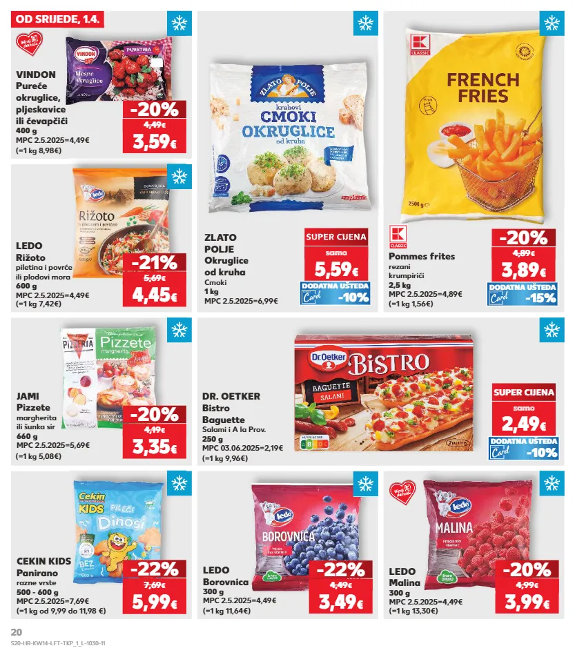 kratkotrajna ponuda kratkotrajna ponuda kratkotrajna ponuda kratkotrajna ponuda kratkotrajna ponuda samo samo samo samo samo kratkotrajna ponuda samo kratkotrajna ponuda kratkotrajna ponuda samo od srijede, 1.4. ledo rižoto piletina i povrće ili plodovi mora 600 g mpc 2.5.2025=4,49€ (=1 kg 7,42€) jami pizzete margherita ili šunka sir 660 g mpc 2.5.2025=5,69€ (=1 kg 5,08€) ledo borovnica 300 g mpc 2.5.2025=4,49€ (=1 kg 11,64€) ledo malina 300 g mpc 2.5.2025=4,49€ (=1 kg 13,30€) -21% -20% -20% -22% -22% 4,45 € 5,69 € 3,35 € 4,19 € 3,99 € 4,99 € 3,49 € 4,49 € 5,99 € 7,69 € (=1 kg od 9,99 do 11,98 €) cekin kids panirano razne vrste 500 - 600 g mpc 2.5.2025=7,69€ (=1 kg 1,56€) pommes frites rezani krumpirići 2,5 kg mpc 2.5.2025=4,89€ (=1 kg 8,98€) (=1 kg 9,96€) vindon pureće okruglice, pljeskavice ili ćevapčići 400 g mpc 2.5.2025=4,49€ dr. oetker bistro baguette salami i a la prov. 250 g mpc 03.06.2025=2,19€ 3,59 € -20% 4,49 € samo 2,49 € super cijena o 2,09 samo 2,09 samo 2,09 samo 2,09 sam samo € o € o 3,89 € -20% 4,89 € -10% dodatna ušteda -15% dodatna ušteda zlato polje okruglice od kruha cmoki 1 kg mpc 2.5.2025=6,99€ kratkotrajna ponuda samo 5,59 € super cijena super cijena super cijena - - super cijena 20% super cijena 20% 20% super cijena o 6,99 samo 6,99 samo 6,99 samo 6,99 sam samo € o € o -10% dodatna ušteda s20-hr-kw14-lft-tkp_1_l-1030-11 20