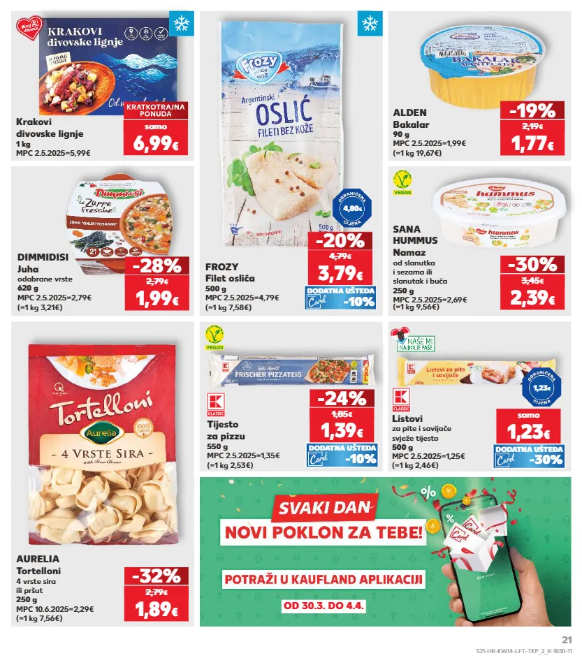 kratkotrajna ponuda kratkotrajna ponuda kratkotrajna ponuda samo samo samo samo kratkotrajna ponuda samo kratkotrajna ponuda samo kratkotrajna ponuda samo od 30.3. do 4.4. krakovi divovske lignje 1 kg mpc 2.5.2025=5,99€ kratkotrajna ponuda kratkotrajna ponuda super cijena kratkotrajna super cijena super cijena kratkotrajna ponuda super cijena super cijena ponuda dimmidisi juha odabrane vrste 620 g mpc 2.5.2025=2,79€ (=1 kg 3,21€) -28% (=1 kg 9,56€) sana hummus namaz od slanutka i sezama ili slanutak i buča 250 g mpc 2.5.2025=2,69€ -30% (=1 kg 19,67€) alden bakalar 90 g mpc 2.5.2025=1,99€ -19% 6,99 € samo 1,99 € 2,79 € 2,39 € 3,45 € 1,77 € 2,19 € (=1 kg 7,56€) aurelia tortelloni 4 vrste sira ili pršut 250 g mpc 10.6.2025=2,29€ -32% 1,89 € 2,79 € (=1 kg 7,58€) (=1 kg 2,53€) frozy filet oslića 500 g mpc 2.5.2025=4,79€ tijesto za pizzu 550 g mpc 2.5.2025=1,35€ 3,79 € -20% 4,79 € 1,39 € -24% 1,85 € -10% dodatna ušteda -10% dodatna ušteda 4,80 € 1,23 € (=1 kg 2,46€) listovi za pite i savijače svježe tijesto 500 g mpc 2.5.2025=1,25€ samo 1,23 € -30% dodatna ušteda s21-hr-kw14-lft-tkp_2_r-1030-11 21