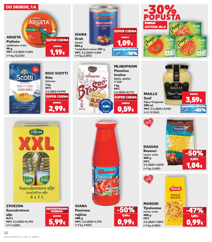 kratkotrajna ponuda kratkotrajna ponuda kratkotrajna ponuda kratkotrajna ponuda kratkotrajna ponuda samo kratkotrajna ponuda samo samo samo samo samo samo kratkotrajna ponuda od srijede, 1.4. ragusa rezanci razne vrste 400 g mpc 2.5.2025=2,09€ (=1 kg 2,60€) riso scotti riža arborio 1 kg mpc 2.5.2025=4,99€ mlinoprom pšenično brašno bijelo, glatko t-550 1 kg mpc 2.5.2025=0,77€ -50% super cijena super cijena (=1 kg 1,46€) giana pasirana rajčica 680 g mpc 2.5.2025=1,79€ -50% super cijena zvijezda suncokretovo ulje 4x1 l mpc 2.5.2025=5,79€ (=1 l 1,50€) kratkotrajna ponuda 5,99 € samo marodi tjestenina razne vrste 400 g mpc 2.5.2025=1,89€ (=1 kg 2,48€) -47% 0,99 € 1,89 € 1,04 € 2,09 € 2,99 € samo 0,59 € samo 0,99 € 1,99 € 1,19 € samo (=1 kg 12,53€) argeta pašteta odabrane vrste 95 g mpc 2.5.2025=1,39€ prego gotova jela -30% popusta (=1 kg 2,28€) giana grah šareni 800 g *ocijeđena masa 480 g mpc 2.5.2025=1,59€ samo 1,09 € super cijena sa o 1,09 sam 1,09 sam 1,09 sam 1,09 sam sam € o € o -10% dodatna ušteda (=1 l 17,95€) maille senf dijon originale 200 ml mpc 2.5.2025=3,99€ samo 3,59 € -45% dodatna ušteda 0,80 € s22-hr-kw14-lft-lmp_1_l-1030-11 22