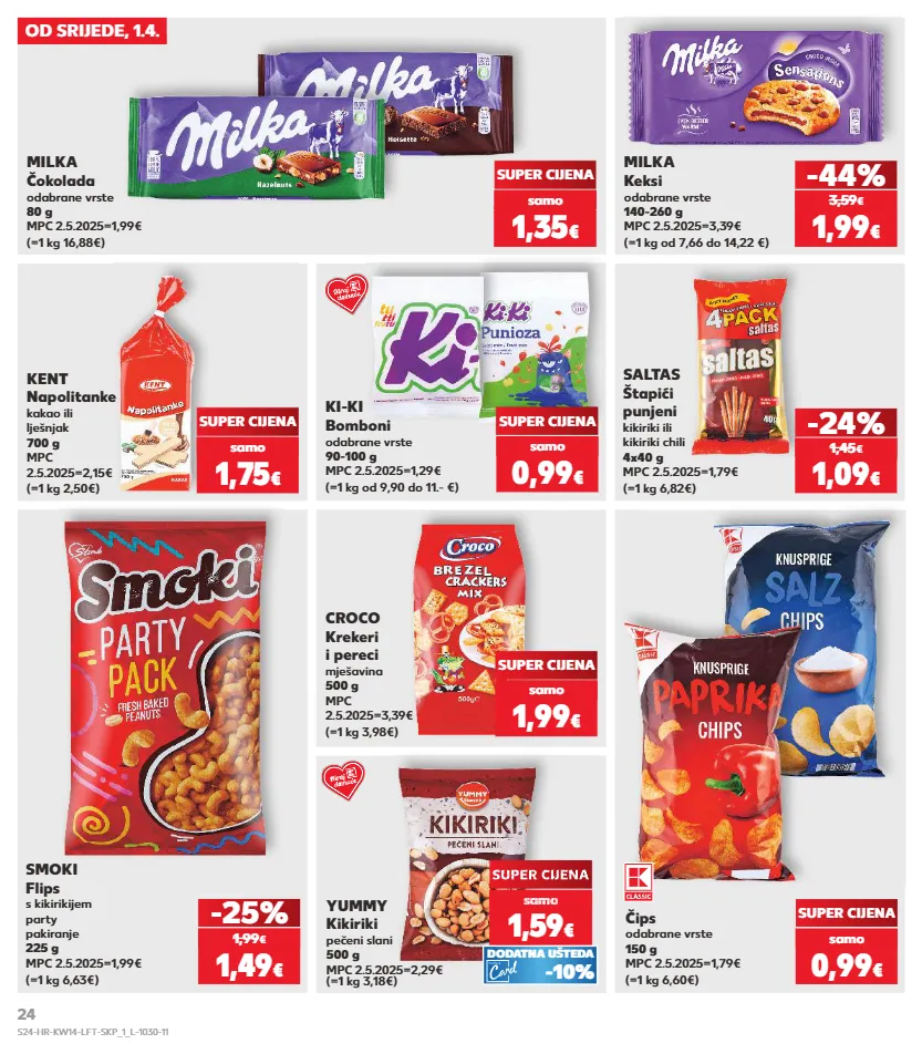 kratkotrajna ponuda kratkotrajna ponuda kratkotrajna ponuda kratkotrajna ponuda kratkotrajna ponuda samo kratkotrajna ponuda samo samo samo kratkotrajna ponuda samo samo samo kratkotrajna ponuda samo od srijede, 1.4. smoki flips s kikirikijem party pakiranje 225 g mpc 2.5.2025=1,99€ (=1 kg 6,63€) kent napolitanke kakao ili lješnjak 700 g mpc 2.5.2025=2,15€ (=1 kg 2,50€) croco krekeri i pereci mješavina 500 g mpc 2.5.2025=3,39€ (=1 kg 3,98€) super cijena -25% super cijena ki-ki bomboni odabrane vrste 90-100 g mpc 2.5.2025=1,29€ (=1 kg od 9,90 do 11.- €) super cijena super cijena 1,35 € (=1 kg 16,88€) milka čokolada odabrane vrste 80 g mpc 2.5.2025=1,99€ -44% 1,75 € samo 1,49 € 1,99 € 1,99 € samo čips odabrane vrste 150 g mpc 2.5.2025=1,79€ (=1 kg 6,60€) super cijena 0,99 € samo 0,99 € samo samo 1,99 € 3,59 € (=1 kg od 7,66 do 14,22 €) milka keksi odabrane vrste 140-260 g mpc 2.5.2025=3,39€ (=1 kg 6,82€) saltas štapići punjeni kikiriki ili kikiriki chili 4x40 g mpc 2.5.2025=1,79€ 1,09 € -24% 1,45 € (=1 kg 3,18€) yummy kikiriki pečeni slani 500 g mpc 2.5.2025=2,29€ kratkotrajna ponuda samo 1,59 € super cijena super cijena super cijena - - super cijena 15% super cijena 15% 15% super cijena sa o 1,89 sam 1,89 sam 1,8 sam 1,89 sam sam € o € o -10% dodatna ušteda s24-hr-kw14-lft-skp_1_l-1030-11 24