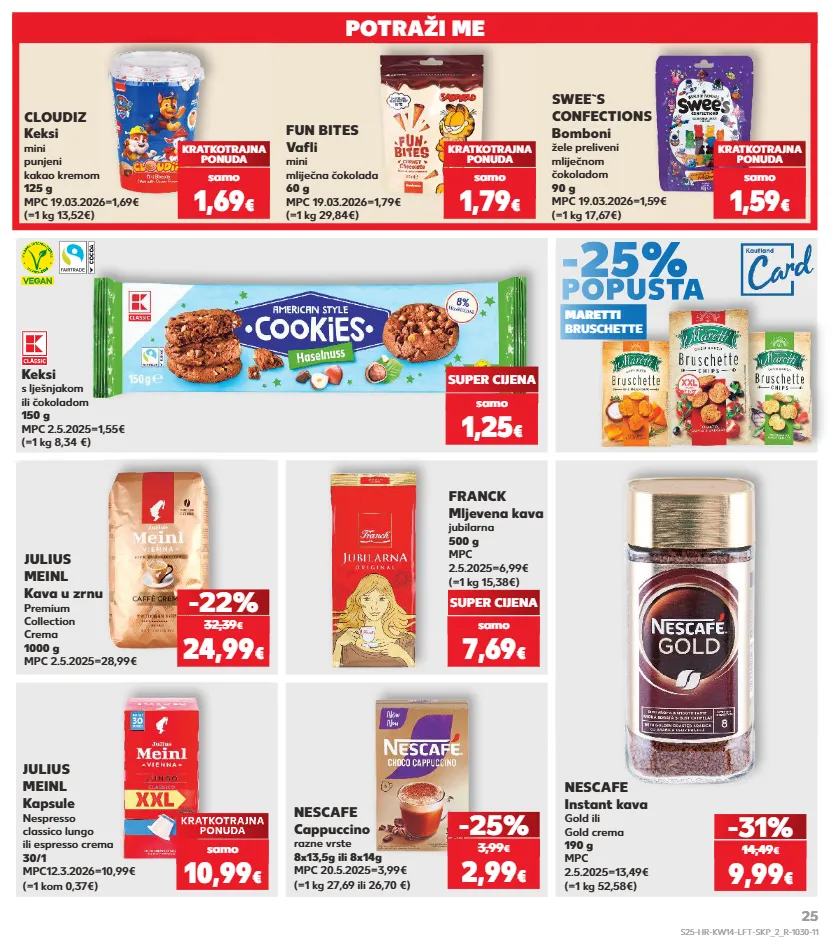kratkotrajna ponuda kratkotrajna ponuda kratkotrajna ponuda kratkotrajna ponuda samo samo samo samo samo kratkotrajna ponuda samo samo samo samo potraži me julius meinl kapsule nespresso classico lungo ili espresso crema 30/1 mpc12.3.2026=10,99€ (=1 kom 0,37€) kratkotrajna ponuda kratkotrajna ponuda super cijena kratkotrajna super cijena super cijena kratkotrajna ponuda super cijena super cijena ponuda julius meinl kava u zrnu premium collection crema 1000 g mpc 2.5.2025=28,99€ franck mljevena kava jubilarna 500 g mpc 2.5.2025=6,99€ (=1 kg 15,38€) nescafe instant kava gold ili gold crema 190 g mpc 2.5.2025=13,49€ (=1 kg 52,58€) -22% super cijena -31% nescafe cappuccino razne vrste 8x13,5g ili 8x14g mpc 20.5.2025=3,99€ (=1 kg 27,69 ili 26,70 €) -25% (=1 kg 29,84€) fun bites vafli mini mliječna čokolada 60 g mpc 19.03.2026=1,79€ kratkotrajna ponuda (=1 kg 13,52€) cloudiz keksi mini punjeni kakao kremom 125 g mpc 19.03.2026=1,69€ kratkotrajna ponuda (=1 kg 17,67€) swee`s confections bomboni žele preliveni mliječnom čokoladom 90 g mpc 19.03.2026=1,59€ kratkotrajna ponuda 10,99 € samo 24,99 € 32,39 € 7,69 € samo 9,99 € 14,49 € 2,99 € 3,99 € super cijena (=1 kg 8,34 €) keksi s lješnjakom ili čokoladom 150 g mpc 2.5.2025=1,55€ 1,25 € samo 1,79 € samo 1,69 € samo 1,59 € samo maretti bruschette -2 5% p opu s t a s25-hr-kw14-lft-skp_2_r-1030-11 25