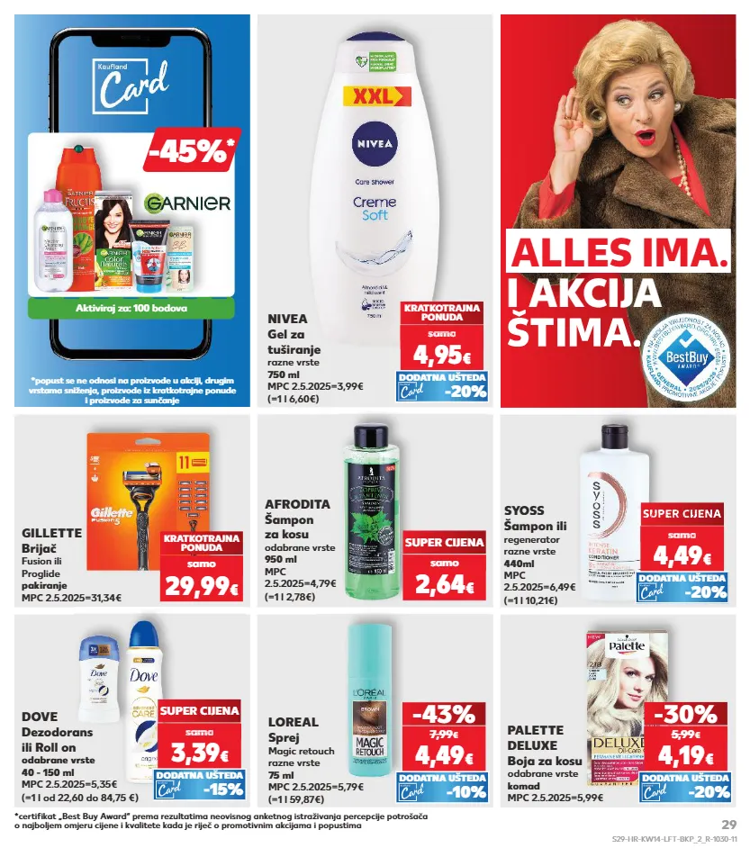 kratkotrajna ponuda samo samo kratkotrajna ponuda kratkotrajna ponuda samo kratkotrajna ponuda samo i akcija štima. alles ima. aktiviraj za: 100 bodova -45% * *popust se ne odnosi na proizvode u akciji, drugim vrstama sniženja, proizvode iz kratkotrajne ponude i proizvode za sunčanje afrodita šampon za kosu odabrane vrste 950 ml mpc 2.5.2025=4,79€ (=1 l 2,78€) super cijena gillette brijač fusion ili proglide pakiranje mpc 2.5.2025=31,34€ kratkotrajna ponuda 2,64 € samo 29,99 € samo (=1 l 10,21€) syoss šampon ili regenerator razne vrste 440ml mpc 2.5.2025=6,49€ (=1 l 6,60€) nivea gel za tuširanje razne vrste 750 ml mpc 2.5.2025=3,99€ kratkotrajna ponuda samo 4,95 € sa o 3,79 samo 3,79 samo 3,7 samo 3,79 sam samo € o € o kratkotrajna ponuda samo 4,49 € super cijena super cijena super cijena - - super cijena 30% super cijena 30% 30% super cijena sa o 6,49 samo 6,49 samo 6,4 samo 6,49 sam samo € o € o (=1 l od 22,60 do 84,75 €) dove dezodorans ili roll on odabrane vrste 40 - 150 ml mpc 2.5.2025=5,35€ dezodorans samo 3,39 € super cijena sa o 3,49 samo 3,49 samo 3,4 samo 3,49 sam samo € o € o -15% dodatna ušteda -20% dodatna ušteda -20% dodatna ušteda (=1 l 59,87€) loreal sprej magic retouch razne vrste 75 ml mpc 2.5.2025=5,79€ 4,49 € -43% 7,99 € palette deluxe boja za kosu odabrane vrste komad mpc 2.5.2025=5,99€ 4,19 € -30% 5,99 € -20% dodatna ušteda -10% dodatna ušteda *certifikat „best buy award“ prema rezultatima neovisnog anketnog istraživanja percepcije potrošača o najboljem omjeru cijene i kvalitete kada je riječ o promotivnim akcijama i popustima štima. s29-hr-kw14-lft-bkp_2_r-1030-11 29