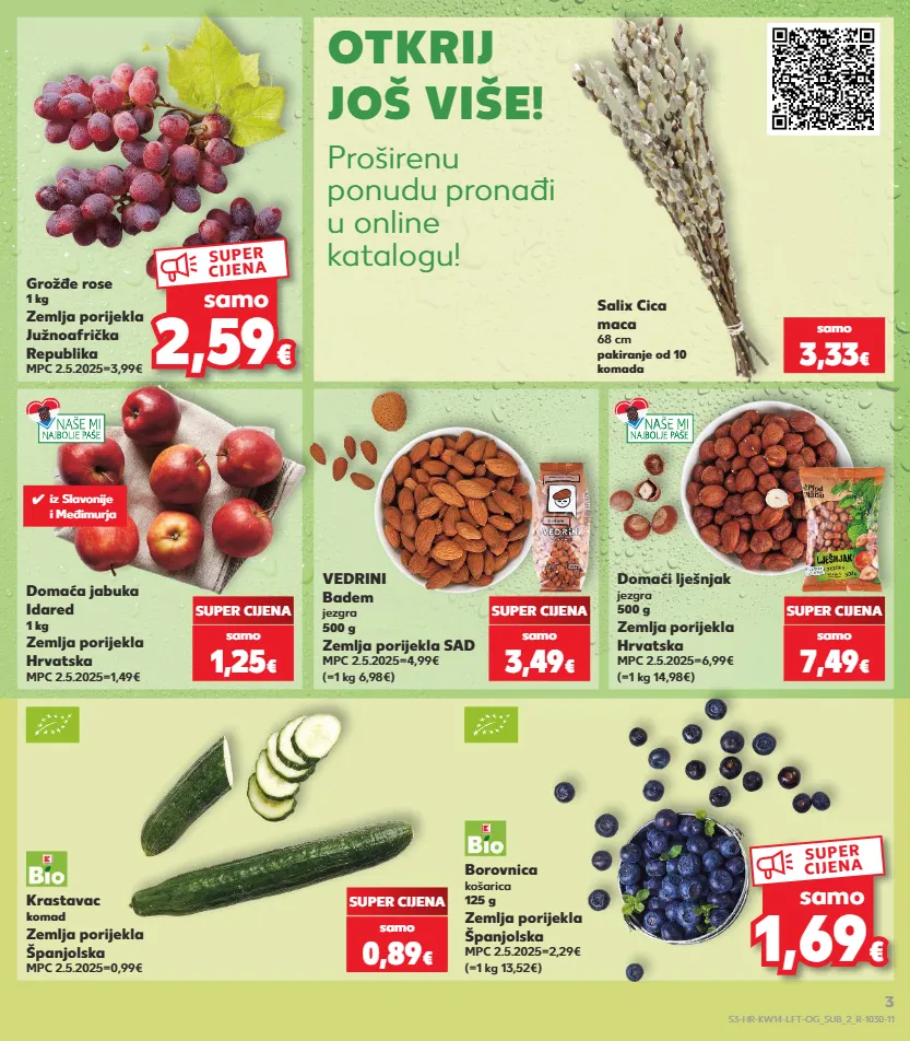 kratkotrajna ponuda kratkotrajna ponuda vedrini badem jezgra 500 g zemlja porijekla sad mpc 2.5.2025=4,99€ (=1 kg 6,98€) domaća jabuka idared 1 kg zemlja porijekla hrvatska mpc 2.5.2025=1,49€ super cijena super cijena domaći lješnjak jezgra 500 g zemlja porijekla hrvatska mpc 2.5.2025=6,99€ (=1 kg 14,98€) super cijena krastavac komad zemlja porijekla španjolska mpc 2.5.2025=0,99€ borovnica košarica 125 g zemlja porijekla španjolska mpc 2.5.2025=2,29€ (=1 kg 13,52€) super cijena grožđe rose 1 kg zemlja porijekla južnoafrička republika mpc 2.5.2025=3,99€ samo 1,25 € samo 3,49 € samo 7,49 € samo 0,89 € salix cica maca 68 cm pakiranje od 10 komada samo 3,33 € otkrij još više! proširenu ponudu pronađi u online katalogu! ✓ iz slavonije i međimurja 1,6 9 1,69 € € samo super cijena 2,5 9 2,59 € € samo super cijena s3-hr-kw14-lft-og_sub_2_r-1030-11 3