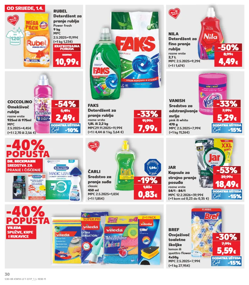 kratkotrajna ponuda kratkotrajna ponuda samo kratkotrajna ponuda samo samo samo kratkotrajna ponuda samo kratkotrajna ponuda samo kratkotrajna ponuda samo kratkotrajna ponuda samo od srijede, 1.4. čarli sredstvo za pranje suđa classic 450 ml mpc 2.5.2025=1,03€ (=1 l 1,85€) -19% -50% (=1 l 1,67€) nila deterdžent za fino pranje rublja razne vrste 2,7 l mpc 2.5.2025=9,29€ kratkotrajna ponuda 10,99 € (=1 kg 1,23€) rubel deterdžent za pranje rublja power fresh 9 kg mpc 2.5.2025=11,99€ -33% 0,83 € 1,03 € 4,49 € 8,99 € samo 7,99 € 11,99 € (=1 l 4,44 ili 1 kg 3,64 €) faks deterdžent za pranje rublja razne vrste 1,8l ili 2,2 kg mpc29.11.2025=11,99€ dr. beckmann sredstva za pranje i čišćenje -40% popusta vileda spužve, krpe i rukavice -40% popusta (=1 kg 11,26€) vanish sredstvo za odstranjivanje mrlja pink ili white 470 g mpc 2.5.2025=7,99€ (=1 kg 27,95€) bref osvježivač toaletne školjke lemon ili quattro flower 4x50g mpc 2.5.2025=7,99€ (=1 kom od 0,23 do 0,35 €) jar kapsule za strojno pranje posuđa razne vrste 54/1 - 84/1 mpc 12.2.2026=39,99€ (=1 l 2,70 ili 2,56 €) coccolino omekšivač rublja razne vrste 925ml ili 975ml mpc 2.5.2025=4,45€ 5,59 € -30% 7,99 € 5,29 € -33% 7,99 € 18,49 € -53% 39,99 € -54% 2,49 € 5,49 € -10% dodatna ušteda -15% dodatna ušteda -15% dodatna ušteda -15% dodatna ušteda popusta pranje i čišćenje pranje i čišćenje pranje i čišćenje 1,04 € do 120 pranja s30-hr-kw14-lft-dtp_1_l-1030-11 30