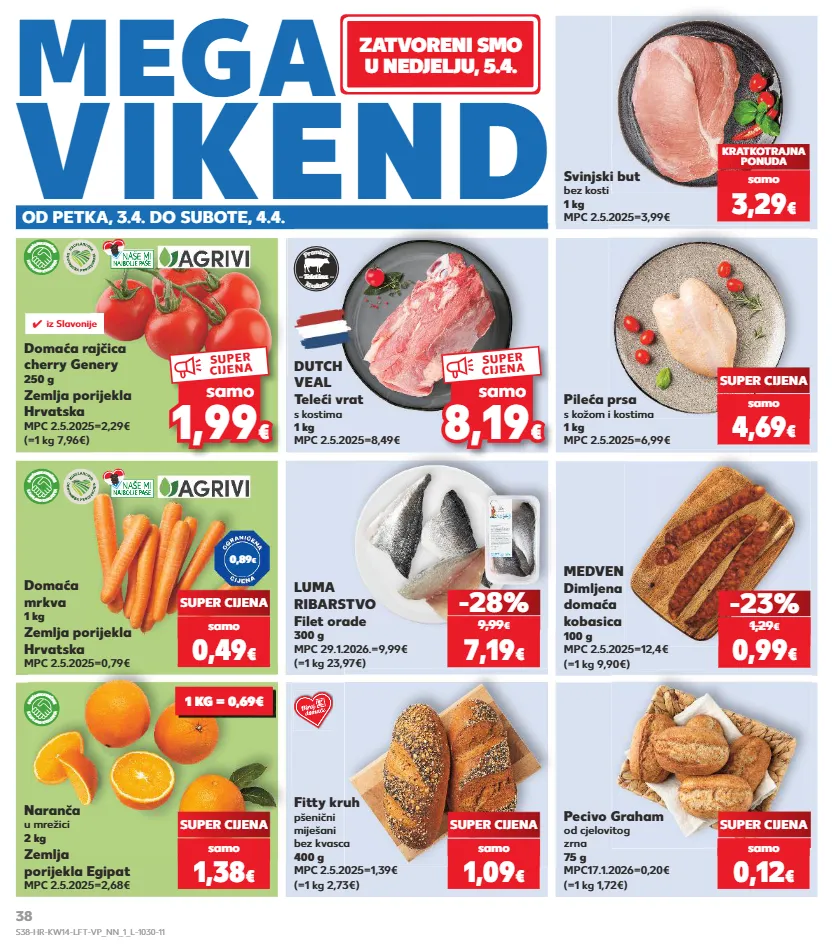 kratkotrajna ponuda kratkotrajna ponuda kratkotrajna ponuda kratkotrajna ponuda kratkotrajna ponuda kratkotrajna ponuda kratkotrajna ponuda samo samo samo samo samo samo zatvoreni smo u nedjelju, 5.4. od petka, 3.4. do subote, 4.4. vikend mega k v a l i t e t a p r e m i u m teletina dutch veal teleći vrat s kostima 1 kg mpc 2.5.2025=8,49€ domaća rajčica cherry genery 250 g zemlja porijekla hrvatska mpc 2.5.2025=2,29€ (=1 kg 7,96€) pileća prsa s kožom i kostima 1 kg mpc 2.5.2025=6,99€ domaća mrkva 1 kg zemlja porijekla hrvatska mpc 2.5.2025=0,79€ medven dimljena domaća kobasica 100 g mpc 2.5.2025=12,4€ (=1 kg 9,90€) naranča u mrežici 2 kg zemlja porijekla egipat mpc 2.5.2025=2,68€ fitty kruh pšenični miješani bez kvasca 400 g mpc 2.5.2025=1,39€ (=1 kg 2,73€) pecivo graham od cjelovitog zrna 75 g mpc17.1.2026=0,20€ (=1 kg 1,72€) k a u f l a n d k v a l i t e t a o b e ć a n j e s v j e ž i n e k a u f l a n d k v a l i t e t a o b e ć a n j e s v j e ž i n e k a u f l a n d k v a l i t e t a o b e ć a n j e s v j e ž i n e super cijena super cijena super cijena super cijena super cijena -23% kratkotrajna ponuda svinjski but bez kosti 1 kg mpc 2.5.2025=3,99€ -28% 7,19 € (=1 kg 23,97€) luma ribarstvo filet orade 300 g mpc 29.1.2026.=9,99€ 4,69 € samo samo 0,49 € samo 1,38 € 1,09 € samo 0,12 € samo 0,99 € 1,29 € 3,29 € samo 9,99 € 0,89 € 1 kg = 0,69€ 8,19 8,19 € € samo super cijena 1,99 1,99 € € samo super cijena ✓ iz slavonije s38-hr-kw14-lft-vp_nn_1_l-1030-11 38